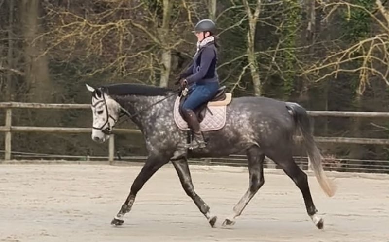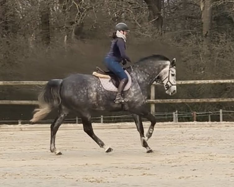 For sale is our lovely and exceptionally personable grey mare, Celtic Celine. She arrived with us at the end of 2023, having been raised in a species-appropriate manner in Ireland. Since then, she has been trained in a versatile manner in dressage, jumping, and trail riding, and has also been presented at competitions. Due to her size, temperament, and character, she is ideally suited as a voltige horse. She has already completed several voltige training sessions here and has proven to be calm, motivated, and free of sensitive points during these exercises. Both her size and her basic gaits have been found very pleasant by the voltige riders. We believe that voltige is her true calling, and therefore, we would be happy to place her as a voltige horse. She is familiar with many exercises in all gaits, including some pair exercises, and shows potential for more advanced tasks. Videos can be sent upon request, as the upload here was not successful. Celine has already gained competition experience in show jumping; she is placed in Spf A and has won a habituation test. At competitions, she remains unexcited, resilient, and does not spook easily. In dressage, she is also easy to ride, comfortable, and moves with steady contact, though she can be somewhat spirited at the beginning. She requires a rider with clear aids to ensure both enjoy working with her. Celine enjoys trail riding and is familiar with both solo and paired rides. She is accustomed to dogs and generally shows little spook and is well-behaved in handling. She loves being groomed and pampered. Of course, she is healthy, shoeable, and loading-friendly. She had a good X-ray exam at age three. We can provide these images upon request. Videos of voltige, jumping, and dressage can be sent via WhatsApp. A trial ride is possible, preferably by appointment after a phone call.