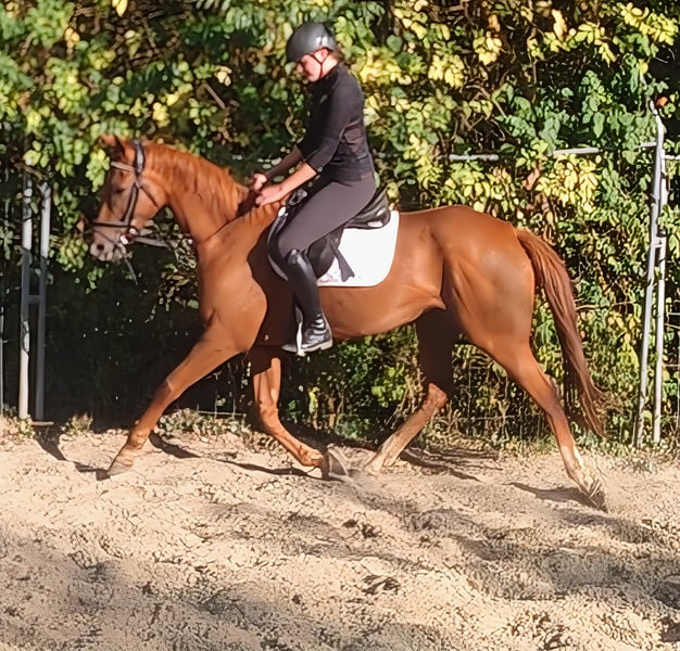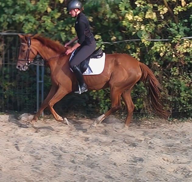 Jument de 6 ans, environ 165 cm, de couleur alezan doré. Agréable à monter et amicale dans ses interactions. Pas très énergique et intéressée par les nouveautés. Une jument avec un mouvement attrayant, qui a été montée ici en manège, sur terrain et en extérieur. Elle connaît les tracteurs, les camions, les chiens, etc. Si besoin, elle peut être vendue avec un nouvel équipement complet à un prix modique. Le transport peut être organisé. Un examen vétérinaire d'achat peut également être effectué par votre propre vétérinaire, y compris des radiographies et des analyses de sang. Nous attendons votre appel au 01774289729. Les demandes écrites ne seront pas répondues.