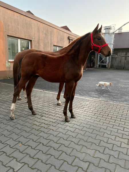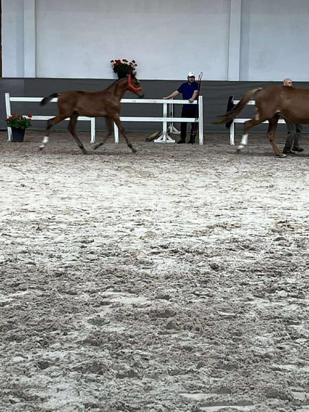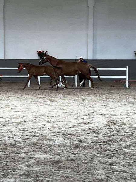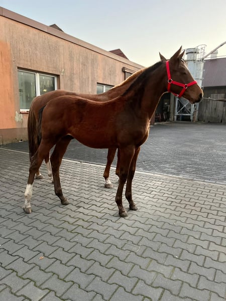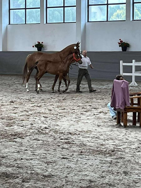 Gniew PM is the son of the stallion Chardo-Blue PS, a licensed stallion, and the mare Goplana, a mare. On the sire's side, he comes from a line of notable horses such as Chardonnay 70, a Holsteiner who placed 6th at the 2018 World Championships, and who also competed in the World Cup finals in 2016 and 2019. Chacco-Blue, a licensed stallion, has been the WBFSH ranking leader from 2017 to 2023. On the dam's side, the bloodlines include Sentender, an experienced eventing horse with a victory in the Okoły 2010 freestyle jumping championship, and Berlin Bej, an older show jumping horse competing in class C. The dam of the dam, the mare Grobla II, finished third at the Bogusławice Training Center with an excellent evaluation.