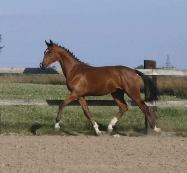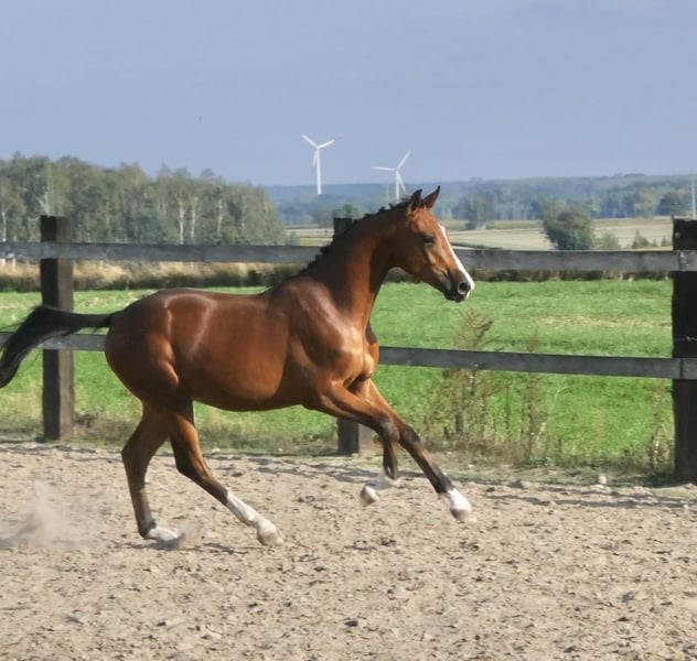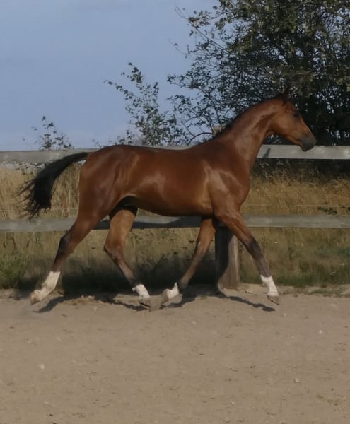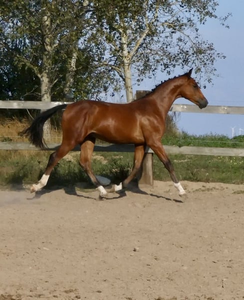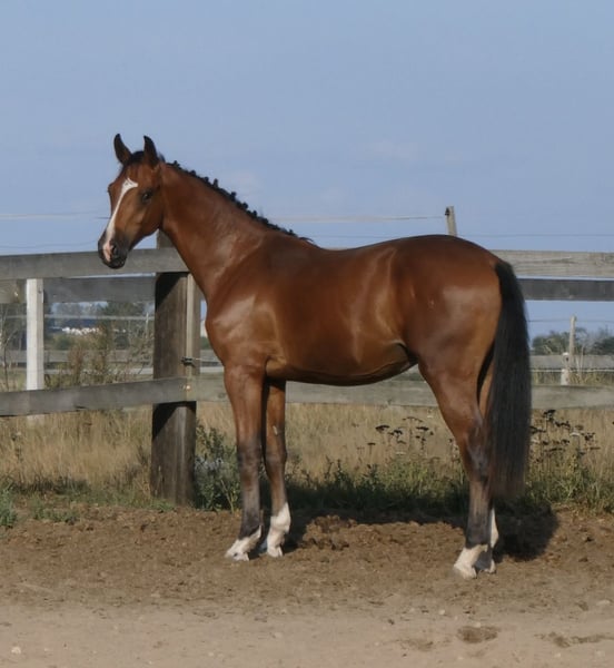Zum Verkauf steht ein Hengst mit Springpferderegister. Sehr brav, an die Führmaschine gewöhnt, wird angebunden zum Putzen, gibt die Beine. Tritt nicht aus, beißt nicht. Trotz seines Springpferderufs beeindruckt er mit sehr angenehmer, elastischer Bewegung.