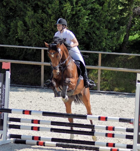 Nach langer Überlegung muss ich mich aufgrund privater und beruflicher Veränderung leider von meinem 9-jährigen Wallach (geb. Mai 2017) trennen. Bumblebee hat ein Stockmaß von 1,75 m und ist ein polnisches Warmblut. Er ist regelmäßig geimpft (halbjährlich Influenza & Herpes, Tetanus), bekommt einmal im Jahr Besuch vom Zahnarzt und halbjährlich Physio. Er hat aktuell keine Eisen und kommt damit auch im Gelände sehr gut klar. Er steht in Boxenhaltung und kommt ganzjährig in einer Wallachherde auf die Koppel. Er ist sowohl mit Wallachen als mit Stuten absolut verträglich. Bumblebee ist in den letzten 3 Jahren bei mir vielseitig beschäftigt worden. Er kennt Ausritte alleine und in der Gruppe und hat sich insbesondere in der Gruppe als sehr brav hervor getan. Wenn er alleine im Gelände unterwegs ist, braucht er meistens noch etwas Sicherheit durch seinen Reiter. Er kennt längere Hängerfahrten, Auswärtstraining, Turniere (mit und ohne Übernachtung) und hat sich hier im Umgang als stets unkompliziert herausgestellt. Er ist am Turnier A* gelaufen und im Training A**, wurde allerdings aufgrund von Zeitmangel meinerseits seit Mitte 2025 nicht mehr gesprungen. Potential für mehr wäre vorhanden, allerdings benötigt Bumblebee beim Springen viel Zeit und eine gute Basis, um die nötige Sicherheit im Parcours zu entwickeln. Da er grundsätzlich deutlich mehr Spaß an vielseitiger Beschäftigung hat und auch zusätzlich regelmäßig dressurmäßig gearbeitet und gymnastiziert sowie im Gelände bewegt wurde, würde ich mir für ihn ein Zuhause wünschen, in dem er ein Leben als ambitionierteres Freizeitpferd genießen kann. Bumblebee ist beim Reiten hin und wieder etwas umweltorientiert, bleibt aber stets händelbar und weist keine Unarten wie Steigen oder Buckeln auf. Aufgrund seiner Größe, seines Alters und Temperaments ist er jedoch nicht für Anfänger/Wiedereinsteiger geeignet. Eine klinische AKU aus 2022 inkl. Röntgenbildern liegt vor. Er war bei mir bisher immer gesund und hat keine bekannten Vorerkrankungen. Eine aktuelle AKU kann gerne auf Kosten des Köufers gemacht werden. Passendes Equipment (Sattel, Trense, Zubehör) ist vorhanden und kann gegen Aufpreis übernommen werden.