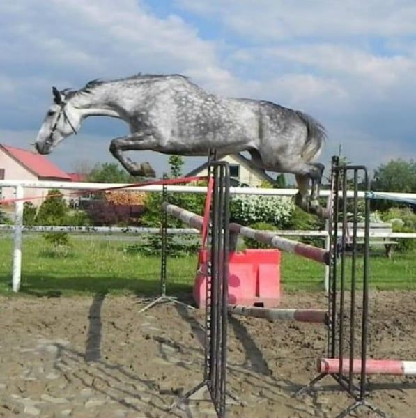 Super Stute mit top Bewegung und Spring Quälitat. Stute hat akzeptiert Reiter sofort und ist grade angeritten. Top Charakter ✅ Gesund- nicht lahm. Gute starke Körperbau und trotzdem schön leicht in Bewegung 🥰 Stute zur Zeit ist ca 160cm- wird wachsen bis ca 165cm. Letzte Bild ist die Mutter (M in dressure und M** ausgebildet im Springen und hat zum Zucht gegangen). Vater Opium springt in USA 150cm. Mehr Infos, Bilde oder Videos per Whats App.