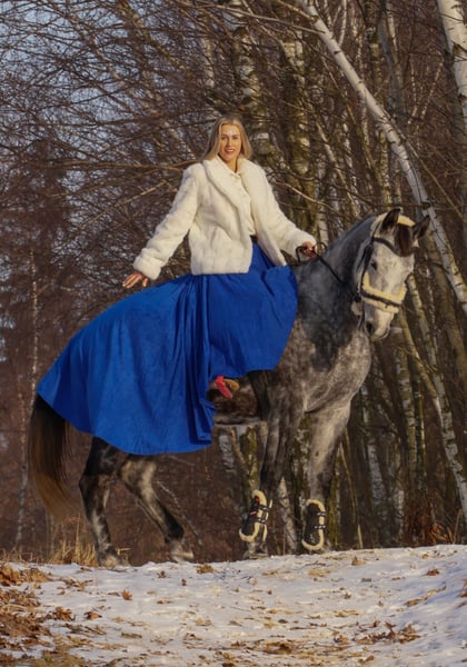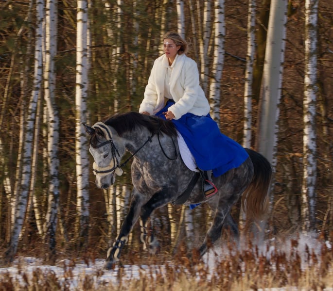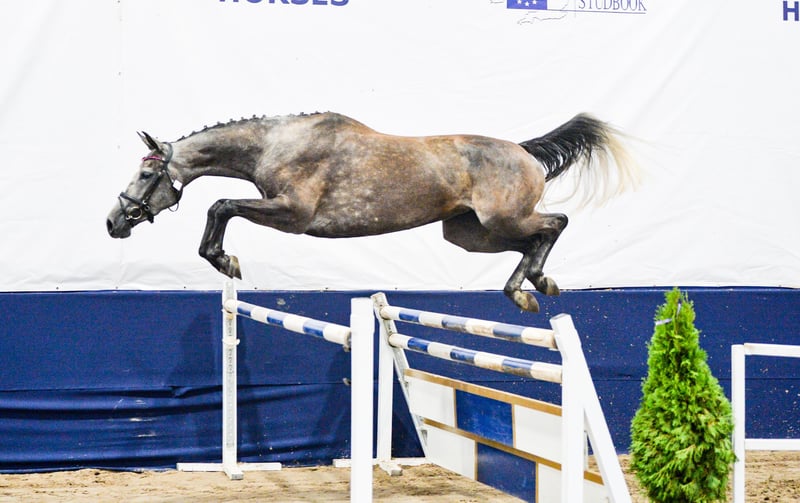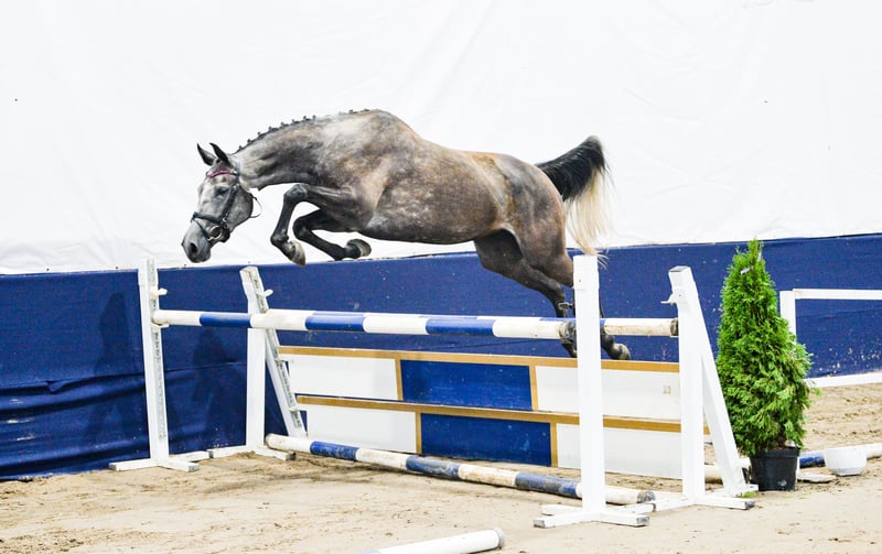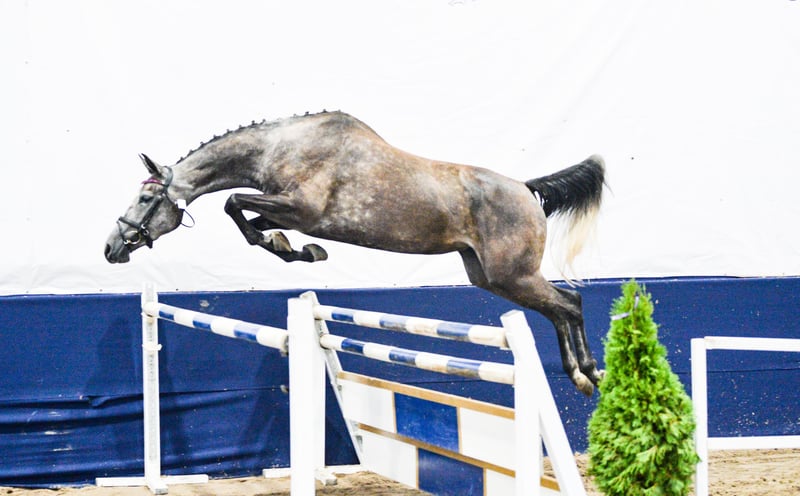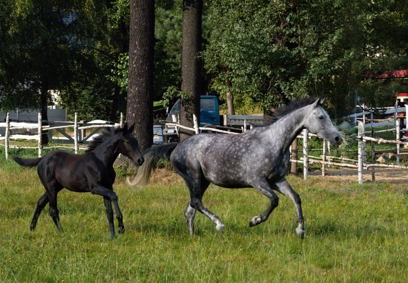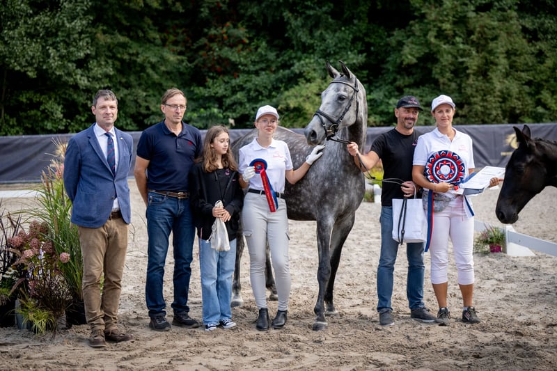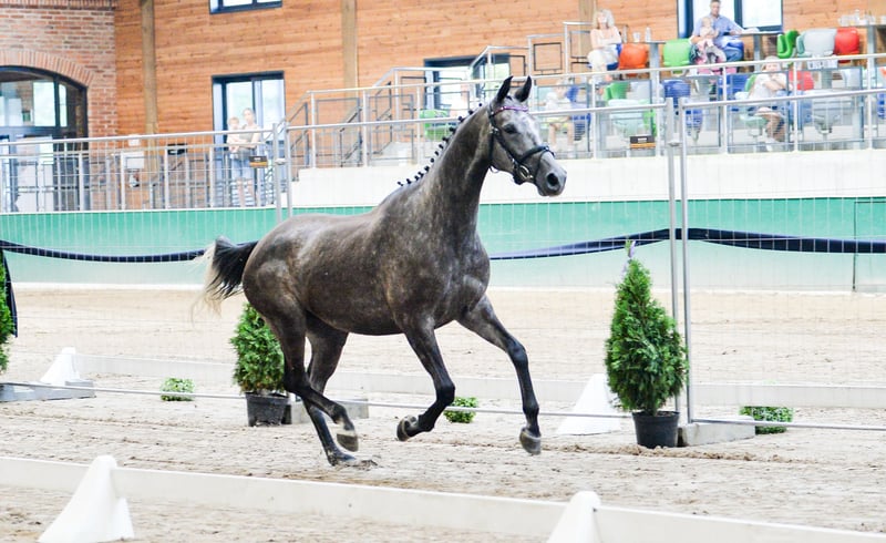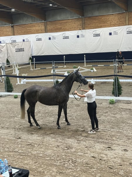 LA VIE EST LADY A very interesting and versatile mare, ready to start a sporting or breeding career. In 2024, she performed excellently at the open championship for noble breed horses, placing third among mares with show jumping bloodlines born in 2021. In 2025, the mare foaled a beautiful, large, well-built filly, which also had success at championships. She foaled on time, without any complications. The filly (mare) is currently with us in the stable after weaning. Possible to purchase as a pair. In autumn 2025, she was backed under saddle very easily and safely. The mare moves comfortably in all three gaits. She is currently ridden out alone in the fields. VERY GOOD HEAD!! The mare is very calm and thoughtful, yet brave and eager to cooperate. She has only been lunged in the corridor. No TUV (veterinary inspection) has been performed. She is easy to handle, groom, and shoe. During the summer, she was kept on free turnout, and in winter, she is stabled only at night. From a breeding perspective, her dam’s pedigree is highly valuable. Her third dam, Gardenia, competed in show jumping at CC1 level and participated in the Polish Senior Championships. La Vie Est Lady descends from the valuable dam line of Georgia (approved mare by Bezimienny), which was primarily bred at the Moszna Stud Farm, and later also at SK Prudnik. Many horses from this family have achieved success mainly in show jumping. Notable jumpers include Gino (CC3 level), Gitta (MPMK-B), Grog (130 cm), Goldmara (145 cm), Gostera (130 cm), Gardes G (140 cm), Grog (130 cm), Gig (150 cm), and Gayall (135 cm). One cannot forget the phenomenal, epoch-defining racehorse Galerius (by Jape xx), who raced and won steeplechase and hurdle races, winning 30 of his 39 starts (!), with 2 second places and 2 third places. He earned a total of PLN 120,356. In this family, there are also eventing horses such as Gio Candio, winner of MPMK-C in the 4-year-old category, Green Light M, Garda (CCI*), and Graal (CNC* level), as well as many licensed stallions – Grog, Gig, Gastin, Gorset, Gregory, Gayall, Grom, and Gladiolus M. Her sire is the gray Hickstetstakkato, a son of the well-known stallion Hickstead White, a 155 cm class horse, winner of the Big Round in Wiener Neustadt (AUT), Lichtenvoorde (NED), and Grand Prix (150 cm) in Linz-Ebelsberg (AUT).