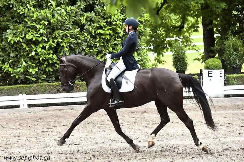 Nous vous présentons Madona – De Niro × Totilas, une élégante jument noire de 9 ans (1m68), née et élevée à l’élevage Ortigão Costa au Portugal. Issue d’un croisement exceptionnel, elle est jument de sport portugais, 3/4 allemande et 1/4 lusitanienne, alliant la puissance et la noblesse des grandes lignées germaniques à la sensibilité et à l’expression du sang ibérique. Madona séduit par son chic. Sa robe noire, son modèle harmonieux et sa prestance naturelle en font une jument qui ne laisse personne indifférent. Mais au-delà de l’apparence, c’est son caractère facile et généreux qui marque le plus : agréable à monter, douce aux soins, fiable en extérieur, elle se montre tout aussi plaisante pour un cavalier expérimenté que rassurante pour des profils moins aguerris. Sous la selle, Madona exprime tout son potentiel. Elle maîtrise déjà avec assurance : les changements de pied au 4, 3 et 2 temps, avec plusieurs au temps en place, un piaffer installé et un passage en construction, des appuyers précis, des demi-pirouettes et un trot allongé s'installant. Avec ces bases solides, elle se présente prête à évoluer rapidement sur le Petit Tour (St Georges), offrant des perspectives sérieuses en compétition. Elle se révèle ainsi idéale pour un junior ambitieux désireux d’accéder au haut niveau, ou pour un amateur confirmé recherchant un cheval de qualité, polyvalent et agréable à vivre au quotidien. Test piroplasmose négatif et son vécu équilibré à l’élevage garantit une jument bien éduquée, respectueuse et habituée aux soins comme aux déplacements. Madona, c’est la rencontre parfaite entre élégance, fiabilité et potentiel sportif. Une jument attachante, prête à écrire une nouvelle histoire aux côtés d’un cavalier exigeant qui saura apprécier sa générosité et son talent.