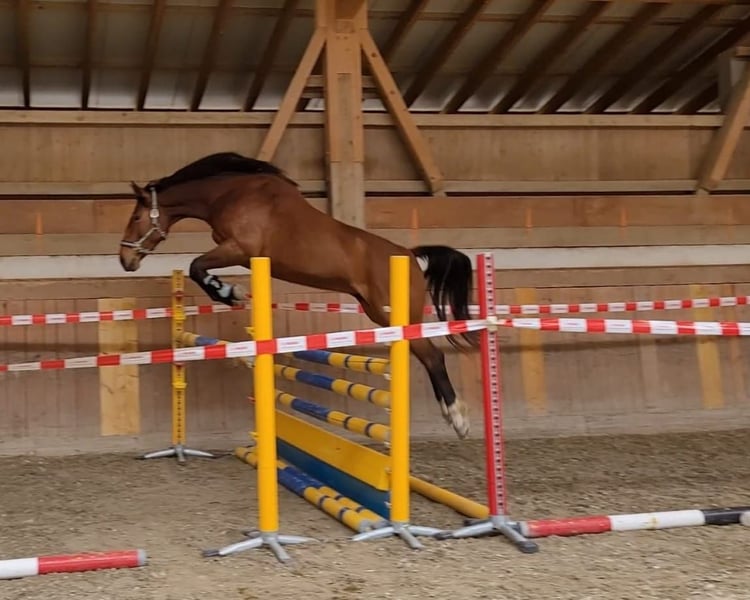 **Verkaufsanzeige: Schweizer Warmblut Wallach, geb. 2021, 175 cm, braun, springbegeistert** Zum Verkauf steht ein beeindruckender Schweizer Warmblut-Wallach, geboren im Jahr 2021. Mit einem Stockmaß von 175 cm vereint er Größe mit einer athletischen Statur, die ihn ideal für den Springsport macht. Valesco hat eine Leistungsstarke Abstammung. Seine Mutter Beau Geste BvR weist Klassierungen bis 1,30m auf. Während sein Vater Van Gogh erfolgreich im Springen bis 1,60m ist. Er besitzt bereits erste Concours Erfahrungen. Sein starker Charakter, verbunden mit einem guten Bewegungsablauf, macht ihn zu einem vielversprechenden Pferd für den Aufbau im Springsport. Der Schweizer Warmblut-Wallach ist gesund und bereit, in ein neues Zuhause umzuziehen, wo er weiter gefördert werden kann. Bei Interesse oder weiteren Fragen stehe ich gerne für eine Besichtigung und Proberitte zur Verfügung. Dieses talentierte Springpferd wartet auf einen engagierten Reiter, der sein Potenzial erkennt und gemeinsam mit ihm neue Erfolge feiern möchte.