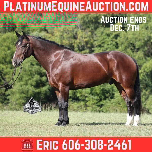 ONLINE AUCTION Place your bids at www.PlatinumEquineAuction.com Starting Bid $3500 Auction ends December 7th, 2025 Need a new saddle? Check out White Rock Saddles on our website or Facebook Meet the Mighty Thor! A beautiful bay draftcross that stands around 16.2hh, that will weigh around 1400lbs and he is a 9 years old. Thor has been through the natural horsemanship program and knows some tricks such as to lay down on command. He has been ridden down the highways and he is traffic safe. He is broke to work under harness in all types of farm machinery. Thor is great on trails and he will cross creeks, ditches, logs and navigate rough rocky areas. He has a smooth jog, lopes nice circles and a good stop! He neckreins around and backs with ease. He has been exposed to all kinds of wildlife such as deer or turkey or other animals like cows or dogs and will go anywhere that he is asked too. He has been ridden many miles in the mountains of Eastern Kentucky and encountered every obstacle possible on the trail. He will go up or down even the steepest slopes, across deep creeks, over downed trees, and over all types of rough terrain while still being sure footed. Thor is not cinchy, cold backed, does not crib or weave. If you are looking for big, beautiful and safe… Thor is your guy!!! Feel free to call Eric 606-308-2461 with any questions. ONLINE AUCTION Place your bids at www.PlatinumEquineAuction.com Starting Bid $3500 Auction ends December 7th, 2025 Need a new saddle? Check out White Rock Saddles on our website or Facebook