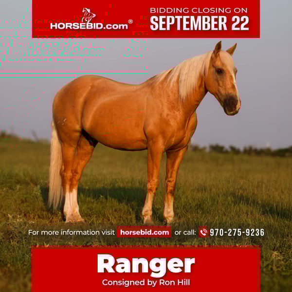 🍁𝒕𝒉𝒆 𝐅𝐀𝐋𝐋 𝑺𝒑𝒆𝒄𝒕𝒂𝒄𝒖𝒍𝒂𝒓🍁 Happening now thru MONDAY | SEPTEMBER 22nd - Available EXCLUSIVELY on HorseBid's website! For more details and to register visit: www.Horsebid.com CONSIGNOR CONTACT: Ron Hill 970-275-9236 LOCATION: Mount Vernon Texas BREED: Crossbred REGISTERED: No REGISTERED NAME: Ranger COLOR: Palomino HEIGHT: 15 AGE: 11 GENDER: Gelding Meet Ranger, a big, handsome palomino gelding who’s spent his life as a true ranch hand. He knows exactly what a full day of work is, whether it’s doctoring yearlings out in the pasture or branding calves from sunup to sundown. When there’s a job to be done, Ranger pins his ears, runs one down, and gives you an honest effort every single time. Despite his grit and work ethic, Ranger is gentle and enjoyable to ride outside of the branding pen. He’s steady and dependable on the trail, making him the kind you can trust in any situation. Ranger is easy to shoe, load, bathe, and tie, and he gets along well with other horses both in the pasture and in the barn. If you’re looking for a strong, reliable gelding with the experience and heart to match, Ranger is the partner you’ve been waiting for.