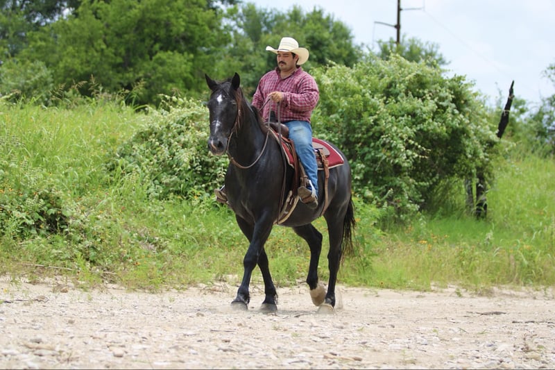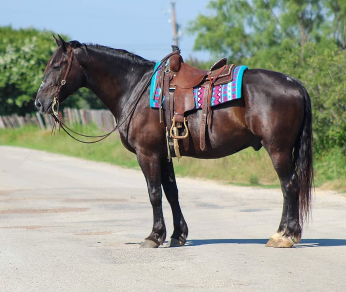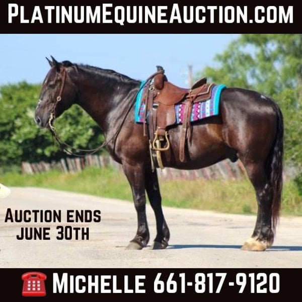 ONLINE AUCTION PLACE YOUR BIDS AT PLATINUMEQUINEAUCTION DOT COM $3500 STARTING BID AUCTION ENDS JUNE 30TH KING KONG is the WHOLE package !! Tall , thick , coal black . He is a 12 year old percheron / quarter horse cross black gelding standing 16.2 hds tall ! He has seen more than most people ! He spent most of his life in Amish country where he was born , raised and trained . He has been used extensively to pull a buggy and has worked the fields . Not only does King Kong drive he rides just as good and is a fun one to take down the trails. There isn’t a mountain he can’t climb , he is sure footed and goes wherever you point him . He will cross logs , bridges , tarps , and water with no issues at all . King is happy to go wherever you point him . He will ride out in a group or by himself . Ride him to town or drive him he’s been around heavy traffic a ton in his life and is not bothered by it. King Kong can carry and pull just about anything. He does great out in a herd setting with other horses , easy to catch in the pasture . He ties , loads and unloads off the trailer great . Stands for the farrier with no issues at all unlike many drafts he stands like a perfect gentleman. If you need help with transport don’t hesitate to ask we have a list of reputable haulers that can get him safely to your doorstep world wide. Located in Stephenville, TX. Contact M $ Performance Horses Michelle 661-817-9120