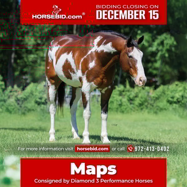 🎄𝐓𝐇𝐄 𝑯𝒐𝒍𝒊𝒅𝒂𝒚 𝐂𝐋𝐀𝐒𝐒𝐈𝐂🎄 Happening now thru MONDAY | DECEMBER 15th - Available EXCLUSIVELY on HorseBid's website! For more details and to register visit: www.Horsebid.com CONSIGNOR CONTACT: Diamond 3 Performance Horses 972-413-0402 LOCATION: Ravenna, TX BREED: draft cross REGISTERED: No REGISTERED NAME: Maps COLOR: Bay and white paint HEIGHT: 16 AGE: 15 GENDER: Gelding Maps stands 16 hands tall and weighs 1350lbs! He is a picture perfect gelding that has spent his a lot of his life on a big ranch in Montana and some of it in Texas gathering cattle and being used for trail rides. He’s been used for gathering cattle, sorting, trailing, calving, and riding fences. This big flashy horse loves people and he is a joy to be around! He was ridden by a man is his 80’s in Montana and took very good care of him. He is sure footed and safe on any trail no matter the terrain. Maps has also been used on several elk hunting trips and is fun to go blaze new trails on or follow the old ones. He truly is a one of a kind gelding to own and have around.