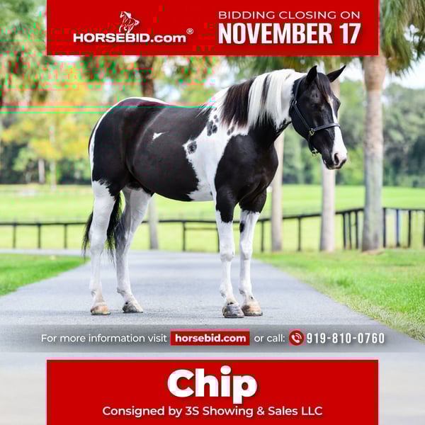 🎲𝓽𝓱𝓮 𝐑𝐈𝐃𝐄𝐑'𝐒 𝓒𝓱𝓸𝓲𝓬𝓮🎲 Happening now thru MONDAY | NOVEMBER 17th - Available EXCLUSIVELY on HorseBid's website! For more details and to register visit: www.Horsebid.com CONSIGNOR CONTACT: 3S Showing & Sales LLC 919-810-0760 LOCATION: Ocala FL BREED: Draft/Paint cross REGISTERED: No REGISTERED NAME: Chip COLOR: Paint HEIGHT: 15 AGE: 4 GENDER: Gelding CHIP 4 coming 5 year old Draft/Paint cross gelding. Chip is the kind everyone dreams of owning — elegant, kind, and endlessly versatile. He’s the perfect size, with a strong, balanced build that suits a wide range of riders. Chip has the foundation to go in any direction. Out on the cross-country course, he’s brave, rhythmic, and all business — confidently jumping banks, ditches, and going into the water, even tackling the down bank into the water without hesitation. Brave, brave, brave to the fences. He’s currently schooling 3’ with ease, showing both the heart and scope to go higher. Simply put, he’s a machine on the cross-country field. In the arena, Chip is an absolute gem. Naturally uphill and soft in the bridle, he’s light, adjustable, and carries his own rhythm beautifully. He’s forward-thinking, with a soft, elastic mouth and an incredibly comfortable way of going. His transitions are smooth, his lead changes are clean, and his movement is balanced, fluid, and eye-catching. Recently, Chip competed at the Florida Horse Park, placing 2nd in the walk-trot cross rails with a 10-year-old rider — under the lights, no less! He didn’t put a foot wrong. At home, he’s recently become my go-to mount for ponying the big stallions, and even when they test him, he stays kind, respectful, and steady. Chip would be a phenomenal partner for a Pony Club rider, talented junior, or amateur looking for a fun, athletic, and safe horse to grow with. He’s as versatile as they come — fancy enough for the show ring and brave enough for the hunt field or cross-country course. Chip is also happy to be ridden western and has a great turn on the haunches. To top it off, he’s even been started driving! Perfect in the stall, outside, alone or with others. No cribbing or weaving. He loads, ties, cross-ties, and clips like a gentleman. UTD on vaccines, Coggins, wormer, and farrier. And yes — Chip’s guilty pleasure is Chips Ahoy cookies! Whose isn’t?!