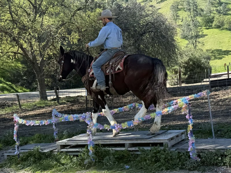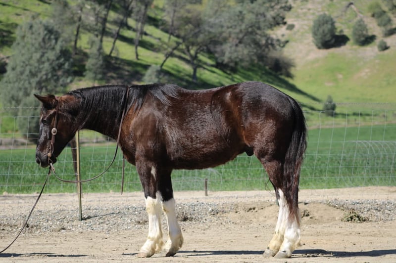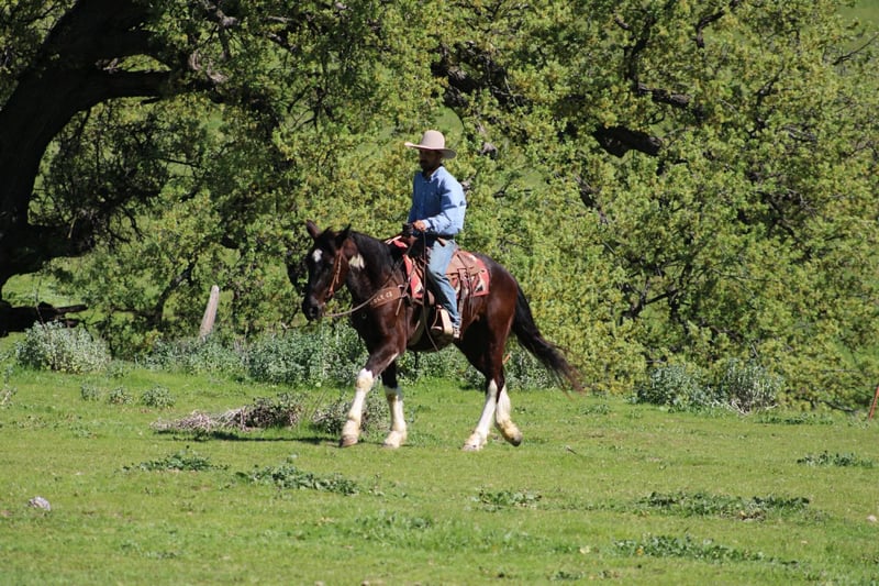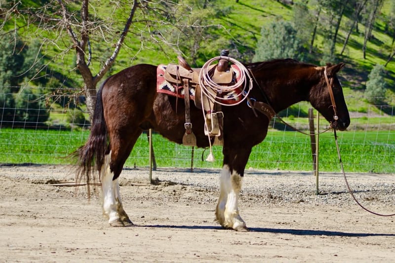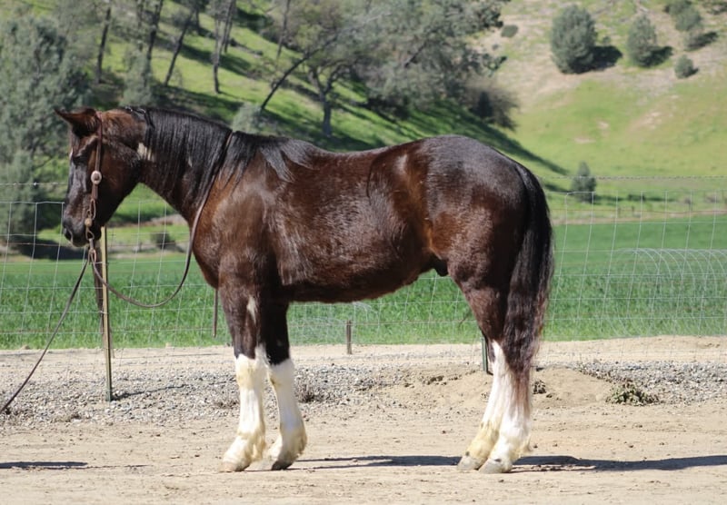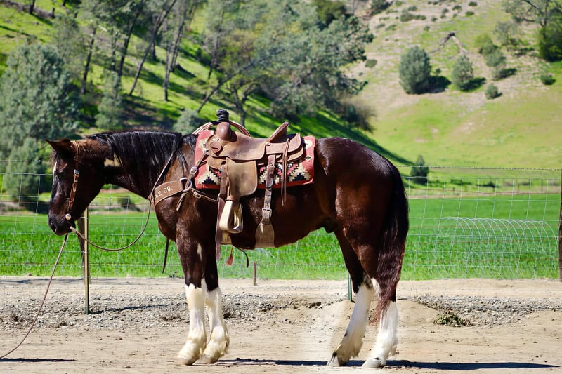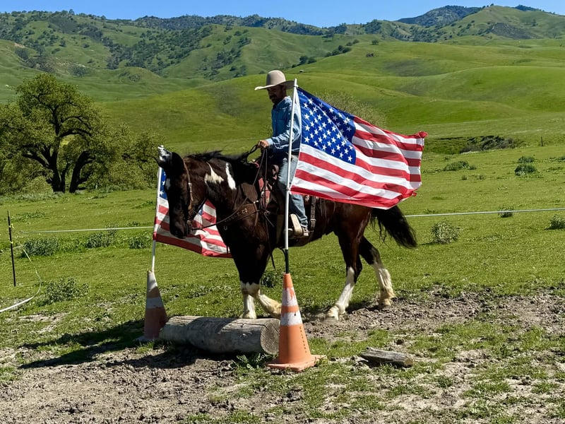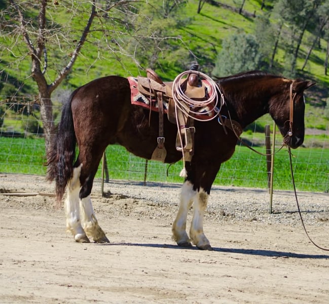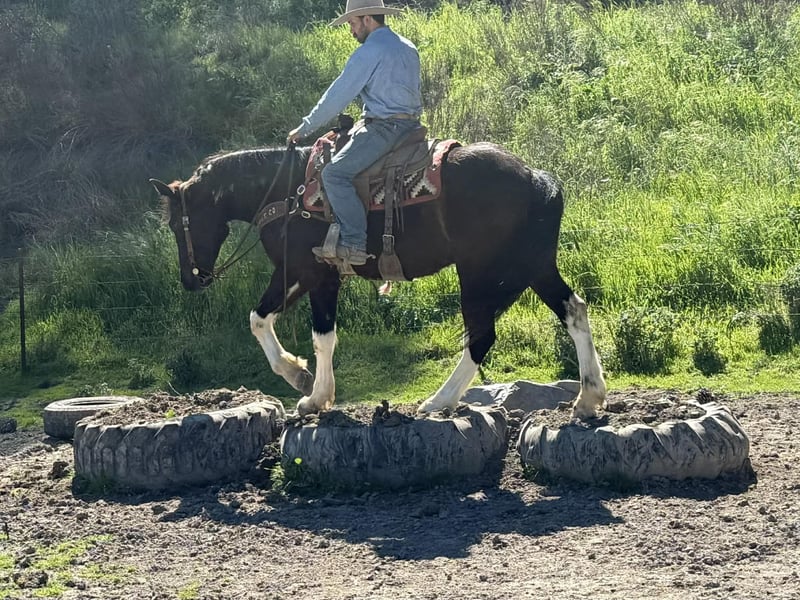 "AVAILABLE ON ONLINE HORSE AUCTION AT www DOT PlatinumEquineAuction DOT com BIDDING OPEN NOW thru SUNDAY | MARCH 22ND! *Final price will be determined on auction site* CONSIGNOR CONTACT INFO: Longhorn Ranch 831-537-1915 LOCATION: Paicines, CA Meet Mater, BIG, KIND, AND BUILT TO LAST — MATER IS THE KIND YOU DON’T COME ACROSS TWICE a striking black and white Paint Draft Cross gelding standing a full 16 hands tall with four high white socks and a splash of white across his belly that makes him easy to spot anywhere. He has the kind of presence that turns heads, but it’s his kind nature and easygoing attitude that truly set him apart. Mater is the definition of a gentle giant. He is quiet, safe, and genuinely enjoys getting out and going places. The type of horse that makes riding fun whether you are a beginner learning the ropes or an experienced rider who appreciates a dependable partner. Around the barn Mater is exactly the kind you want. He ties quietly, clips, hauls well, and stands patiently for the farrier. He has excellent ground manners and is simply easy to be around. Under saddle he rides around with confidence and balance. In the arena he lopes nice correct circles, has a good stop with a smooth slide, and performs a simple turnaround. He stays relaxed and willing, making him comfortable and enjoyable for a wide range of riders. Outside the arena is where Mater really shines. He has been used to gather cattle, ride through creeks and ponds, and navigate obstacles with ease. Trails, rough country, water crossings, and new places are all taken in stride. Point him in a direction and he is happy to go. With his size, athletic ability, and wonderful mind, Mater could go many directions. He would make an excellent trail partner, ranch horse, English prospect, light jumping prospect, or simply a dependable horse to enjoy cruising the countryside. At coming five years old, Mater has his whole future ahead of him and the kind of foundation that makes him exciting for years to come. Draft crosses with this combination of size, disposition, and rideability are hard to find. Mater truly is one of the coolest horses we’ve had the pleasure of offering. Safe, kind, broke, and built to be your next great partner — Mater checks all the right boxes. Located in Paicines, California Contact: Dina – Longhorn Ranch (831) 537-1915 Nationwide shipping available. We are happy to assist in arranging reliable transportation anywhere in the United States or Canada. Veterinary exams and PPEs are always welcome at the buyer’s expense. Mater is proudly offered by Longhorn Ranch.