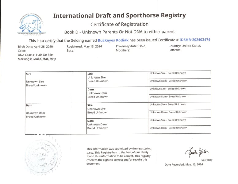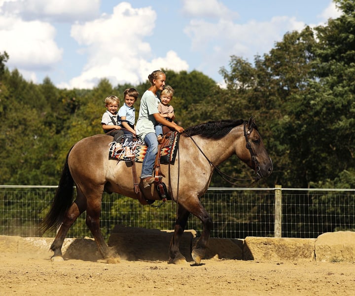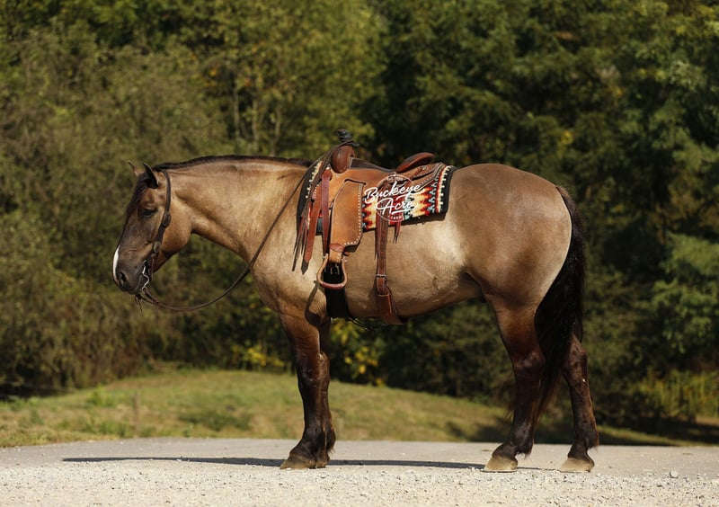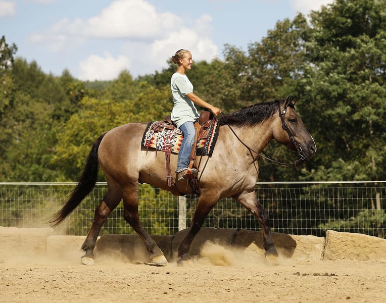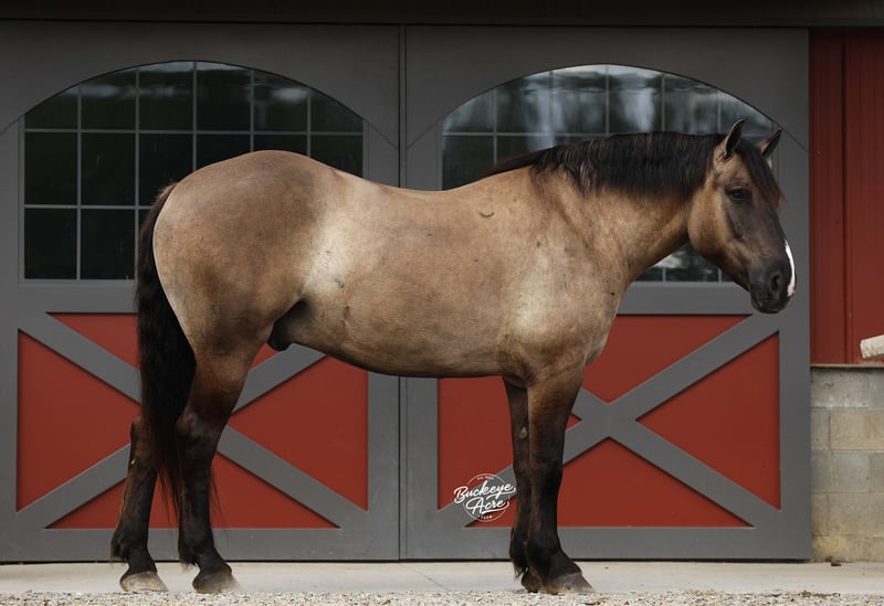 Wow, wow—where can you find a draft cross gelding with this much presence, color, and talent? Meet Kodiak, a 2020 grulla draft cross gelding standing a proud 16.2 hands tall. With his striking coat, solid build, kind eyes, and that handsome white snip on his nose, Kodiak is the kind of horse that turns heads wherever he goes—and then wins hearts with his quiet, trustworthy personality. Kodiak has been about everywhere you could take a horse. He is steady on trails, whether stepping over logs, winding through creeks, climbing hills, or strolling down into valleys. Nothing seems to rattle him, he takes it all with calm confidence and a willing attitude. He has been down busy state roads, meeting traffic head-on without a fuss, making him a safe and dependable partner in any setting. He is also well-desensitized to whips, tarps, jugs, and even gunfire, taking everything in stride. This gelding is as versatile as they come. He has been ridden western, English, bareback, and even bridle less. In the arena, he knows his leads, has a smooth lead change, and rides easily off a one-handed neck rein. With three smooth gaits, he is a joy to ride. His lope is that classic rocking-chair gait you can settle into for hours, while his walk and trot are steady, comfortable, and easy to ride for anyone. We believe Kodiak could be your next trusted trail riding companion—or even your partner for fox hunting. Whether you are looking for a steady mount for long rides or a bold partner to take into the hunt field, Kodiak has the size, stamina, and mind to handle it. Truly, he will go whichever direction you want to take him. What sets Kodiak apart, though, is his people-loving personality. He wants to be your best friend, greeting you at the gate or the stall door, always ready for attention, scratches, or just a moment with his person. The kids ride him with confidence, and he has proven himself safe and steady for riders of all ages and levels—beginner, advanced, or senior, Kodiak adjusts to his rider and gives them his all. Kodiak is well-cared for and up to date on all vaccinations, dental care, and deworming, giving you peace of mind that he is healthy, happy, and ready to go. He is the kind of horse that does not need to be ridden every day to stay the same. Whether you ride him daily, weekly, or only when you have the time, he will be the same honest and dependable horse every time you saddle him up. He is the partner you can count on and the one that makes you smile just to look at him. Kodiak is the full package: beauty, brains, ability, and a heart that wants nothing more than to please his rider. Horses like him do not come around often, he is truly one of a kind. If this sounds like the horse that you have been looking for, please feel free to reach Duane 330-231-2324 for more information or to schedule a day to see him in person.