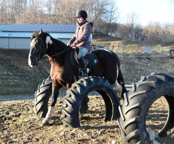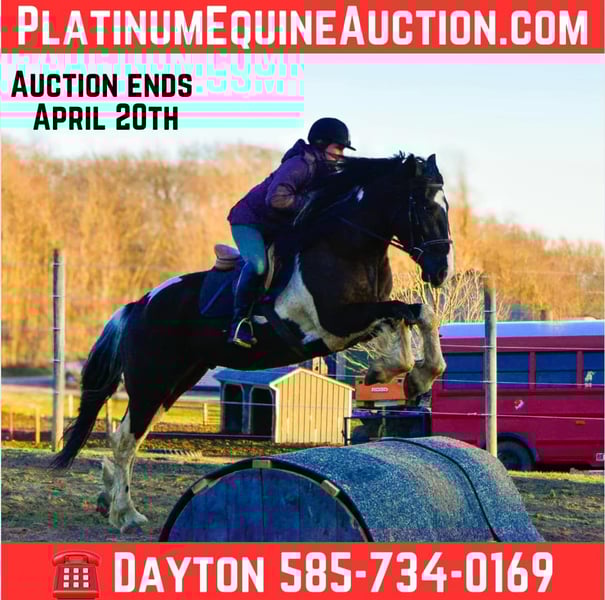 ONLINE AUCTION Place your bids at www.PlatinumEquineAuction.com Starting Bid $3500 Auction ends April 20th, 2025 Need a new saddle? Check out White Rock Saddles on our website or Facebook! O Romeo, Romeo! Here is a 4-year-old draft cross gelding, standing at an impressive 16.3 hands tall. This horse has unlimited potential and is ready to find his forever person. He is a Friesian/ spotted draft cross. This stunning gelding is indeed the whole package from head to toe! Romeo has excellent conformation, clean legs, big bones, and nice big hooves. He has a clean PPE and is ready for his next adventure in life. Romeo is a delight to work on and be around. He stands quietly for the vet and farrier and does not require stocks. He will stand patiently tied while you brush and saddle him up. Romeo loads easily and rides calmly in the trailer; he unloads quietly and is ready to work. He is easy to bathe and pamper and is content in a stall or turned out to pasture. Under saddle, Romeo is a very uncomplicated ride. He is soft laterally, has an excellent “whoa,” moves off your leg nicely, and has a nice back, side passes, and spins. Kids, teens, and adults have ridden him, and they all enjoy him; he can take a joke and will try anything you ask! He recently went to Equifest, where a youth rode him in an opening ceremony carrying a flag. We have been riding him both English and Western and have found he is versatile and happy in both disciplines. He is quiet and confident on the trail and will go anywhere you point him. He easily navigates rough terrain up and down grades, through water, over downed trees, and trailblazing through the woods. He has been exposed to cows, dogs, goats and sheep. He recently went on a week-long trail-riding camping trip to Kansas and loved it. Romeo will trot poles and take a jump with ease. Don’t feel like riding? Then take him for a drive! Romeo hooks quietly and drives off calmly. I believe this gelding would make an excellent mount for anyone looking for a quiet and simple horse to take from the arena to out on the trail and even into the show pen; his willing mind and calm demeanor make him a super adaptable and easy horse to get along with no matter the level of rider/handler. He sells sound without vices or limitations. We are located in Warsaw, NY. Contact Dayton Wolcott for more information 585-734-0169 ONLINE AUCTION Place your bids at www.PlatinumEquineAuction.com Starting Bid $3500 Auction ends April 20th, 2025 Need a new saddle? Check out White Rock Saddles on our website or Facebook!