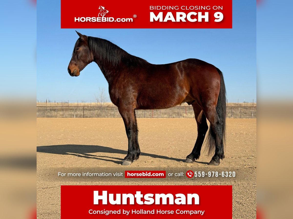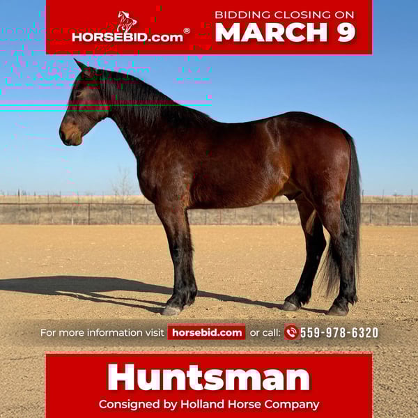 ℳ𝒶𝓇𝒸𝒽 ♦️𝐑𝐈𝐃𝐄𝐑'𝐒 𝐂𝐇𝐎𝐈𝐂𝐄♦️ Happening now thru MONDAY | MARCH 9th - Available EXCLUSIVELY on HorseBid's website! For more details and to register visit: www.Horsebid.com CONSIGNOR CONTACT: Holland Horse Company 559-978-6320 LOCATION: Weatherford, TX BREED: Draft Cross REGISTERED: No REGISTERED NAME: Huntsman COLOR: Bay HEIGHT: 16.2 AGE: 6 GENDER: Gelding Huntsman is a well-rounded, 6-year-old draft cross gelding standing 16.2 hands tall. He is the same well-behaved, good-minded gelding every single day and is an absolute pleasure to be around and ride. Huntsman is broke to ride English, Western, and Drive. He took to fences like he was born to jump—he absolutely flies over them and shows tremendous potential. He has been fox hunted first flight and was nothing short of perfect: brave, forward, tons of stamina, and will jump anything asked of him. He is a big, athletic mover with beautiful natural collection. We’ve taken him to the ranch where he proved to be sure-footed, solid, and confident—he will cross anything. Huntsman rides out quietly alone or in a group and is happy in new environments. On the ground, he has excellent manners: easy to catch, stands quietly in a stall, or lives happily turned out with others. He is UTD, sound, straight, and clean-legged. 📞 FMI: Call or text Chanel at Holland Horse Company 559-978-6320 We’re happy to answer questions, schedule a test ride, and help arrange nationwide shipping.