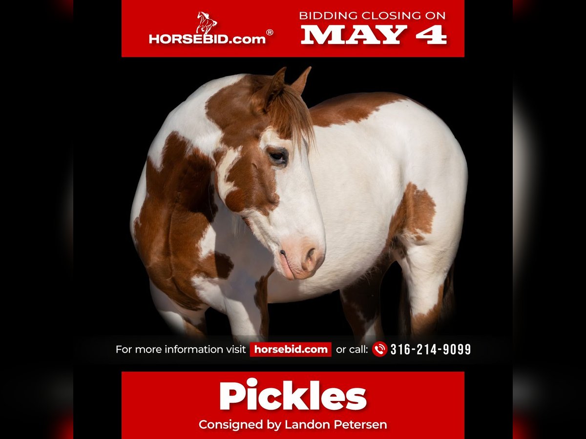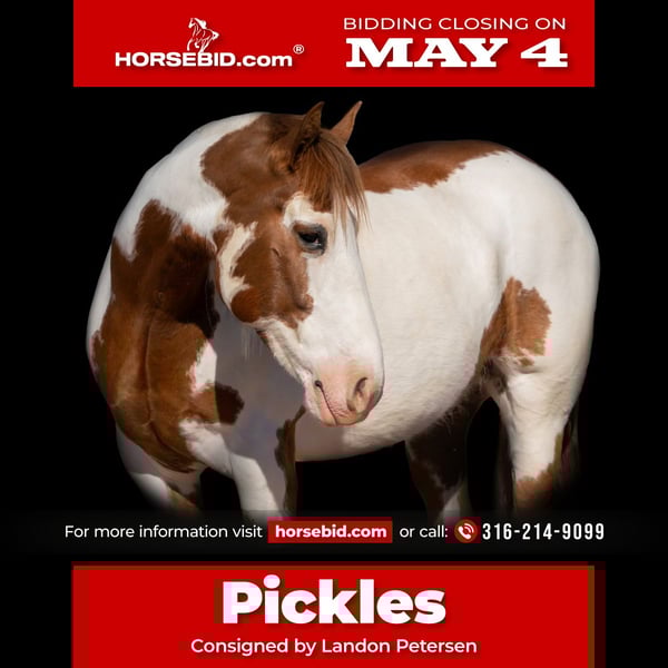 ▪️▫️◾️𝐭𝐡𝐞 𝑴𝒂𝒚 𝐒𝐞𝐥𝐞𝐜𝐭◾️▫️▪️ Happening now thru MONDAY | MAY 4th - Available EXCLUSIVELY on HorseBid's website! For more details and to register visit: www.Horsebid.com CONSIGNOR CONTACT: Landon Petersen 316-214-9099 LOCATION: Sedgwick, KS BREED: Draft Cross REGISTERED: No REGISTERED NAME: Pickles COLOR: Paint HEIGHT: 15.1 AGE: 6 GENDER: Gelding Pickles is a 6-year-old draft cross gelding with all the size, looks, and move you could want. He rides light in the face and soft in the sides—collects up, spins, and stops just like one should. He’s done everything from picking up broncs to trail riding, day working, toting little kids around, and even carrying flags. He’s been my go-to horse for dragging calves to the fire, gathering pairs, and sorting cattle. I brought him to Arizona, and he was the one I’d trust anyone on to ride through the washes and rough trails because he’s sure-footed and takes care of his rider. Pickles is truly one of a kind. Gentle enough for beginners, yet athletic and hardworking enough for someone who wants to get a job done. Don’t miss the opportunity to own one like him; draft crosses this nice don’t come around often.