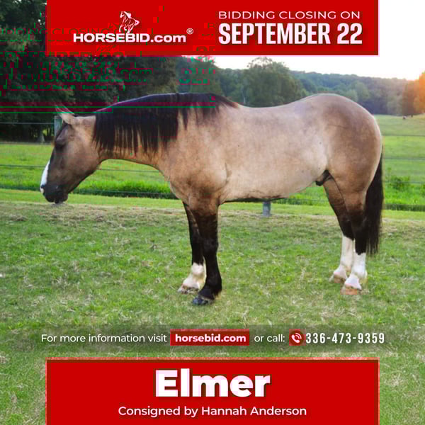 🍁𝒕𝒉𝒆 𝐅𝐀𝐋𝐋 𝑺𝒑𝒆𝒄𝒕𝒂𝒄𝒖𝒍𝒂𝒓🍁 Happening now thru MONDAY | SEPTEMBER 22nd - Available EXCLUSIVELY on HorseBid's website! For more details and to register visit: www.Horsebid.com CONSIGNOR CONTACT: Hannah Anderson 336-473-9359 LOCATION: Lexington NC BREED: Draft cross REGISTERED: No COLOR: Grulla HEIGHT: 15.3 AGE: 6 GENDER: Gelding Elmer is a 6 year old 15.3 hand percheron quarter horse cross. He is an absolute puppy dog with the sweetest demeanor. A true melt your heart personality! He rides in the arena with a solid walk trot canter.He collects himself and rides off leg pressure.He rides on a loose rein and is a very simple comfortable ride as well as picks up correct leads, stops nicely and backs up with ease. Elmer has been trail ridden through creeks, crossed logs, bridges, traffic safe, nothing phases him and he handles every situation calmly and mannerly. On the ground he is in your pocket with impeccable ground manners, respects your space and stands quietly for tacking, bathing, clipping ect. He gets along with everyone and is a pleasure to have around. He sells sound. He does require light lunging with time off.