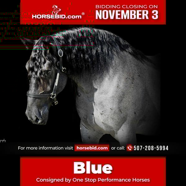⚜️𝐓𝐇𝐄 𝐅𝐀𝐋𝐋 𝐇𝐄𝐑𝐈𝐓𝐀𝐆𝐄 𝐂𝐋𝐀𝐒𝐒𝐈𝐂⚜️ Happening now thru MONDAY | NOVEMBER 3rd - Available EXCLUSIVELY on HorseBid's website! For more details and to register visit: www.Horsebid.com CONSIGNOR CONTACT: One Stop Performance Horses 507-208-5994 LOCATION: Holmen, WI BREED: Draft Cross REGISTERED: Yes REGISTERED NAME: Grand Slamm COLOR: Blue Roan HEIGHT: 16.2 AGE: 6 GENDER: Gelding Grand Slam, now affectionately known as Blue, was sold this past February to a wonderful buyer who instantly fell in love with him. Unfortunately the buyer has recently had some health changes that prevents him from being able to ride, and will prevent him from riding in the future. He has made the extremely hard decision to find Blue a new home with someone who can enjoy him for all that he is. Blue has been kept at a beautiful boarding facility where he has been admired by everyone there and enjoyed by all who come in contact with him. Depsite his owners inability to currently ride, he has made sure that Blue still gets ridden and enjoyed on a weekly basis by the trainer at the barn to stay in shape. Blue is truly a gem of a horse and the kind that you own only once in your lifetime. This big bodied, lovable gelding is the epitome of why crossbreds have become so popular. He is 16.2 1/2hh of a Labrador retriever in a horse’s body, and all wrapped up in a beautiful blue roan package. And that big kind eye is a direct reflection of his character. This gelding has been in the same program the majority of his life, raised up from a colt, started the right way, and enjoyed by countless different people. He came into my program 5 months ago after sitting out to pasture for about a year and he has been the most reliable, steady Eddy, do anything on anytime kind of horse. Just an absolute Gem. In all the years I have been in the horse business I have never had a horse as reliable and safe in absolutely any situation as him. This is the kind of horse that can sit in your pasture off for months, you can pull in, throw anyone on halter and lead rope bareback and take right down the road into any environment with zero hesitations. Grand Slam drives both single and double. Has worked in the fields, driven in town, and given multiple sleigh rides. Under saddle he will impress you by how well trained and supple he is for his size. He is so comfortable to ride, very smooth, and as easy and uncomplicated as they come. He will stay soft, supple and pliable on direct contact or ride around level headed on a slack rein, or no bridle at all. He side passes, pivots, lopes/canters right off on cue, stops with just your seat, and does lateral work. He rides the same in a snaffle, bridle bit, or just a rope halter. He has been to multiple different arenas, public venues, and works great in large crowds. Nothing phases him. He loves the outdoors, trails, open fields, rides down the roads, alone or with groups, and handles any and all kinds of traffic. And here is the fun part about him. This horse absolutely LOVES being a jungle gym! Literally anything you could think of possibly doing horseback, Grand Slam will do……..other than winning any races. Lol. This gelding is trained to lay down on command and sit up like a dog. And he will stand like a statue for hours being crawled all over, and played around on. You can throw 3 people up on him bareback, ride him backwards, crawl all over him or under him, and do it all in a high traffic arena, he is always a rock. Can crack bullwhips on him, carry the flag, cover him in a tarp, drag anything behind him, pony colts from him, you name it he will do it like he’s done it his entire life. This is the horse you can pull out for absolutely anyone to enjoy…..beginners, kids, grandparents, large groups, you name it. He never gets sour or tired of any of the shenanigans, he just truly enjoys it. But yet the more experienced riders also enjoy him because the more you ask of him the more he will impress you. Grand Slamm is very easy to keep, requires no special maintenance of any kind, and is comfortable living outside in a mixed herd or stalls beautifully. He literally gets along with absolutely anyone, and despite his size, he is even gentle around the smallest of ponies or young colts. He is great with dogs, cats, and all other livestock or hobby farm animals. He is UTD on all cares, including dental, vaccines, and coggins. He is great for the vet and even your farrier will be impressed by how easy and well mannered he is to trim or shoe. He is absolutely gentle in every way. This horse would be the perfect fit for just about anyone……from a beloved family member serving everyone, to a multiple rider program suiting and working for all levels, sizes and abilities of the riders, or the individual looking for their once in a lifetime partner to truly enjoy and do it all with. He is solid, steady, forgiving, tolerant, trustworthy, and has a heart of gold that is willing to do anything. IDSHR registered, his dam was a percheron X quarter horse cross and his sire is a full percheron. He will also come with his coggins, health certificate, and recent dental form as well as his leather halter with his name plate. This is truly such a special horse that will be sure to put a smile on everyone’s face. Please be sure to watch his video in it’s entirety as it shows a whole lot. Arena riding (both dressage and western riding), trails, in town, driving, and a whole lot of tricks & shenanigans. Feel free to reach out anytime to discuss him further. Nationwide hauling assistance is also available. One Stop Performance Horses does not won this horse and is acting as Seller’s Agent