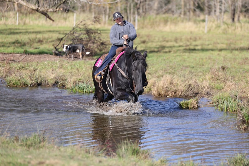 ⚜️DER HERITAGE-KLASSE HERBST⚜️ Läuft jetzt bis MONTAG | 3. NOVEMBER – Exklusiv auf der Website von HorseBid verfügbar! Für weitere Informationen und zur Anmeldung besuchen Sie bitte: www.Horsebid.com VERKAUFERKONTAKT: Cole Stevens 651-387-8781 STANDORT: Riverfalls, WI RASSE: Kreuzung ZÜCHTUNG: Nicht registriert FARBE: Schwarz HÖHE: 16,3 hh ALTER: 6 Jahre Geschlecht: Wallach Immer wieder suchen Leute nach einem großen, hübschen Kreuzungspferd – und wir haben endlich eines, das alle Kriterien erfüllt! Toby ist ein 6-jähriger Kreuzungs-Geländepferd, tiefschwarz, steht bei 16,3/17 Händen und wurde für alles Mögliche eingesetzt, was man mit einem Pferd machen kann. Toby hat alle möglichen Aufgaben auf dem Hof erledigt: Wir haben ihn zum Einfangen und Kastrieren von Fohlen benutzt, mit ihm Ausritte gemacht, und er lässt sich von nichts aus der Ruhe bringen. Er ist zuverlässig und unkompliziert! Toby reitet sowohl in der Arena als auch draußen, und er kann wie ein Quarter Horse galoppieren. Er ist sehr gut leitend, lässt sich einhändig reiten und sogar bridleless. Auch englisch geritten wurde er bereits, sodass es egal ist, ob Sie englisch oder western reiten – er ist einfach nur dabei und will gefallen. Vor seiner Zeit bei uns wurde er bei Rodeos als Flaggenpferd eingesetzt und auch genutzt, um Rinder aus der Arena zu treiben. Er hat die Lichter und die Musik vor großem Publikum gesehen! Er ist sanftmütig und bleibt es, hat eine große Persönlichkeit und möchte immer dein Freund sein. Für diesen Wallach ist keine Aufgabe zu groß oder zu klein. Verpassen Sie nicht diesen tollen Wallach – er wird überall auffallen. Er ist bereit für sein neues Zuhause, wo jemand ihn nutzen und genießen kann. Toby hat gute Hufe, ist gerade und sauber im Bein. Bei Fragen rufen Sie mich gerne an unter 651-387-8781. Er wird ausschließlich auf Horsebid.com angeboten!