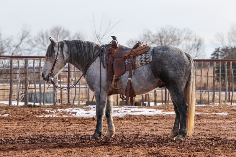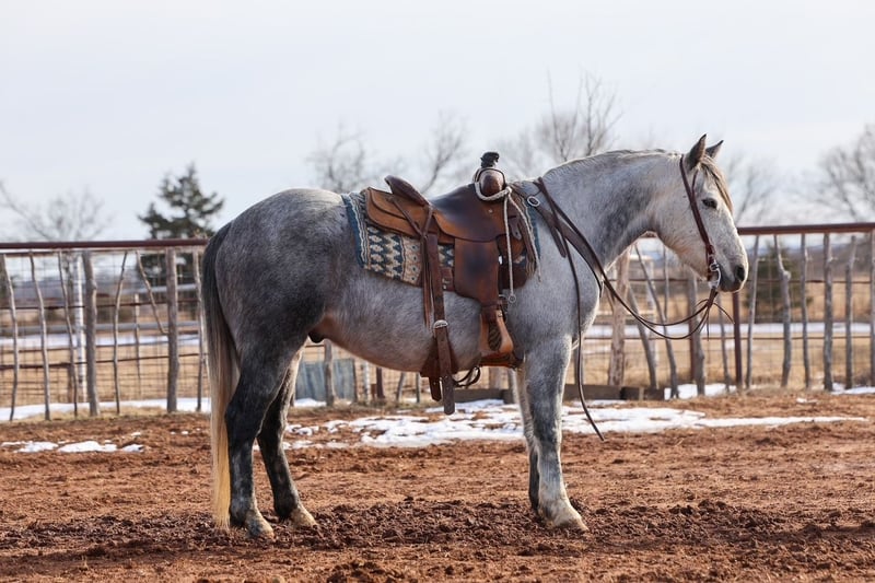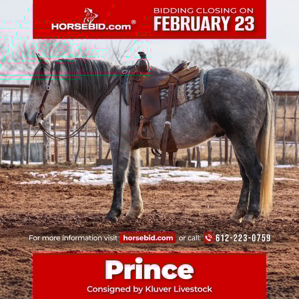 💎 𝐓𝐇𝐄 𝓓𝓲𝓪𝓶𝓸𝓷𝓭 𝐒𝐇𝐎𝐖𝐂𝐀𝐒𝐄 💎 Happening now thru MONDAY | FEBRUARY 23rd - Available EXCLUSIVELY on HorseBid's website! For more details and to register visit: www.Horsebid.com CONSIGNOR CONTACT: Kluver Livestock 612-223-0759 LOCATION: Ripley, OK BREED: Crossbred REGISTERED: No REGISTERED NAME: Prince COLOR: Dappled grey HEIGHT: 14.3 AGE: 8 GENDER: Gelding Prince is a one of a kind gelding… You can’t beat this horses looks or ride. He is a 8 year old dappled grey grade gelding standing at 14.3 hands tall and weighing 1050 pounds. He’s small but mighty! Prince may be on the shorter side but he sure is thick. He is built with great confirmation packing a thick neck, big hip, nice top line, and thick solid clean legs. Now let’s talk about those hair goals! He has a gorgeous long thick tail, with a forelock to die for followed by a long thick mane. He is dappled nearly all over and they only get better in the summer! His favorite company are his people if he could follow you everywhere all day he would! He is always wanting to be loved on and the main focus of attention. He is truly the package deal horse with looks that will leave you staring and a ride that’s unbeatable! He has the background of being a kids ranch horse for most of his life with a great start under his belt. Don’t let that fool you when needed he can sure hustle. He is a one hand broke broke gelding your kids, aunts, uncles, the whole family can get on him and spin him around! He has a great solid stop and an even better turn around. You can put your kids on him to go sort or doctor cows for the whole day and never worry. He has been used for anything and everything multiple times. You can sort cows, doctor your wheat cattle, swing a rope off of him, trail ride all day and night, show his buttons off in the arena, jump him around english, ride him through town to get your arronds done, carry your family members around when they visit, take him skiing, practically anything you wish! We know he can do it all because we’ve done it all with him! He is a horse that you never have to worry about… he’s a easy keeper, easy to catch, and good with other horses. Leave him sitting for months, go and saddle him up and lope him off with not a worry in the world! This is a horse you can show off no matter where you take him, I guarantee people will ask about him!