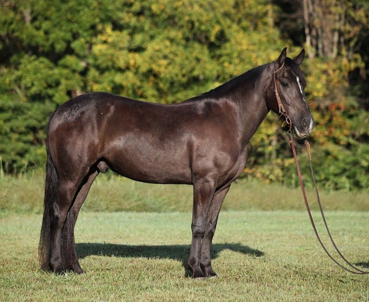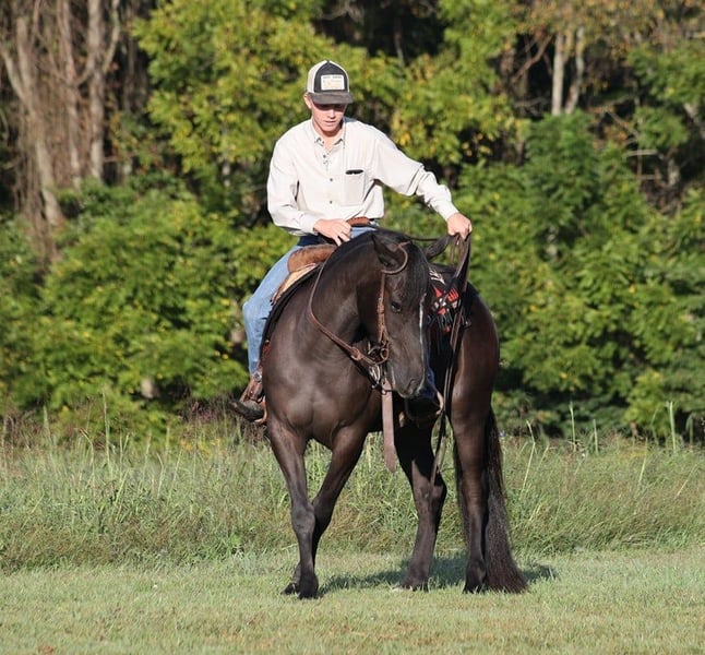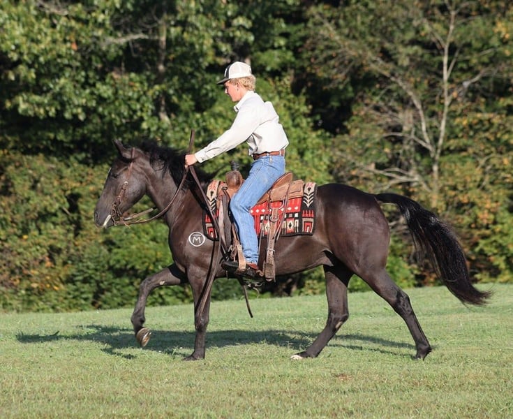 ONLINE AUCTION Place your bids at www.PlatinumEquineAuction.com Starting Bid $3500 Auction ends October 6th, 2024 Need a new saddle? Check out White Rock Saddles on our website or Facebook! Batman is a jet black quarter horse cross gelding standing around 14.3hh and he is 6 years old. He is one classy looking guy! Not only does he look classy, he is has all of the other boxes checked as well… he is Mr. Personality, as friendly as they come, loves attention and is very calm natured. Batman has that calm nature that makes him a great family horse and he is a horse that anyone will get along with. Batman has been ridden by every member of our family and he is safe! He has been ridden down the highways and he is traffic safe as well. Batman is great on trails and he will cross creeks, ditches, logs and navigate rough rocky areas. He has a smooth jog, a VERY VERY nice easy to set lope, a good stop, turns a circle both ways and backs with ease! He has been exposed to all kinds of wildlife such as deer or turkey or other animals like cows or dogs and will go anywhere that he is asked too. He has been rode many miles in the mountains of Eastern Kentucky and encountered every obstacle possible on the trail. He will go up or down even the steepest slopes, across deep creeks, over downed trees, and over all types of rough terrain while still being sure footed. Batman is not cinchy, cold backed, does not crib or weave. Batman is a super cool horse that anyone is sure to love!!! Feel free to call Moore Trained Horses Logan 765-265-0033 with any questions. ONLINE AUCTION Place your bids at www.PlatinumEquineAuction.com Starting Bid $3500 Auction ends October 6th, 2024 Need a new saddle? Check out White Rock Saddles on our website or Facebook! ONLINE AUCTION Place your bids at www.PlatinumEquineAuction.com Starting Bid $3500 Auction ends October 6th, 2024 Need a new saddle? Check out White Rock Saddles on our website or Facebook!