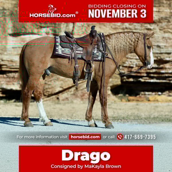 ⚜️𝐓𝐇𝐄 𝐅𝐀𝐋𝐋 𝐇𝐄𝐑𝐈𝐓𝐀𝐆𝐄 𝐂𝐋𝐀𝐒𝐒𝐈𝐂⚜️ Happening now thru MONDAY | NOVEMBER 3rd - Available EXCLUSIVELY on HorseBid's website! For more details and to register visit: www.Horsebid.com CONSIGNOR CONTACT: MaKayla Brown 417-669-7395 LOCATION: Purdy, MO BREED: Draft Cross REGISTERED: No COLOR: Red Dun HEIGHT: 15.2 AGE: 7 GENDER: Gelding Drago is a 7-year-old gelding with an exceptional temperament and a calm, steady nature. He has that “greet you at the gate,” personality and is incredibly easy to be around. Zero maintenance and uncomplicated, he’s quiet and respectful during feeding, saddling, tying, and just about anything else you ask of him. Very independent, so no buddy sour issues here! Drago has real experience under his belt—he’s been used for gathering and moving cattle out in the pasture, as well as penning cattle at the stockyards. He’s dependable and willing when there’s a job to do, and he handles new environments with ease. He’s been on numerous trail rides and overnight camping trips, and has even been around the commotion of chuckwagon races, where he handled loud noises and a variety of distractions without issue. Naturally laid-back and kind-hearted, Drago is a true gentleman with a solid mind. He’s also an eye-catching mover and presents beautifully in English tack, showing his versatility. Standing 15.2 hands, Drago is a great height with exceptional frame and bone. 100% sound and sane, you are sure to love this guy when you get him home! Located in Purdy, Missouri. Would be happy to help arrange shipping. For more information or questions, please feel free to contact MaKayla Brown.