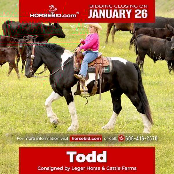 𝐉𝐀𝐍𝐔𝐀𝐑𝐘 ⭐️𝑨𝒍𝒍 𝑺𝒕𝒂𝒓 𝑳𝒊𝒏𝒆𝒖𝒑⭐️ Happening now thru MONDAY | JANUARY 26th - Available EXCLUSIVELY on HorseBid's website! For more details and to register visit: www.Horsebid.com CONSIGNOR CONTACT: Leger Horse & Cattle Farms 606-416-2570 LOCATION: Crab Orchard, KY BREED: Spotted Draft Horse/Quarter Horse Crossbred REGISTERED: No REGISTERED NAME: Todd COLOR: Black and White HEIGHT: 16 AGE: 8 GENDER: Gelding Todd and Tucker are a dynamic duo that you sure do not run across every day! These boys are so very special! They are Spotted Draft Horse/Quarter Horse crossbreds and are full brothers. Todd is 8 years old and Tucker is 9. They were raised by some good Amish friends of ours until we purchased them a year and a half ago. These two have endless experience in just about everything you could imagine. From being phenomenal driving horses, to having the smoothest one-step lope, to being one of the best hands around the ranch, to even being trick horses- Todd and Tucker are truly the best team of horses we have ever owned. They are 100 percent safe, sound, skilled and experienced horses with the sweetest, most pleasant, willing to please attitude. As Spotted Draft Horse/ Quarter Horse crossbreds, Todd and Tucker have all of the best qualities of each breed. Their size, color, build and disposition come from the draft side of them, with their agility, intelligence and versatility being attributed to the quarter horse in them. Todd and Tucker stand 16 hands and are built wonderfully- they have a big foot and bone, and are thick made with a great conformation. On the ground, Todd and Tucker are complete gentleman. Our little girl who is only 8 can handle either or both of them together with ease, confidently. Even with their size, she knows she can trust them. They are respectful of your space, they stand tied patiently, stand in the wagon patiently and with the extensive liberty work they’ve had, they will even follow you around at the command to come. In the saddle, these boys are a dream ride. They both one-hand neck rein, have a super smooth one-step lope, a big stop and will back up and turn around in a circle like a quarter horse. They take their correct leads both ways and respond to leg pressure. They are completely experienced in both the indoor and outdoor arenas. We’ve also ridden them on countless miles of trails. It doesn’t matter what type of terrain, or what kind of challenge they face- they will take you where you want to go. Our entire family has enjoyed trail riding these guys! From mud to rocks to sliding over steep hills to deep water- they’ve done it all! They are safe and surefooted to get you where you need to go. Todd and Tucker are also amazing driving horses. I could not count the miles they have been driven and worked as a team. They know their job and do it well and look AMAZING while doing it. They are so classy and they move with elegance. They sure do turn heads! They are completely traffic safe as well. We’ve driven them to town, to and through our cattle farm that’s up the road, in parades and even used them in a live drive-thru nativity scene to give people wagon rides! From the tiniest babies to the oldest grandpas, Todd and Tucker safely gave them rides in the wagon! They are surely a trusted team! Todd and Tucker are also trick horses. They have both been trained to lay down and sit up! They are both super intelligent animals. They will also side pass to a mounting block or whatever you choose to mount from. These brothers have also been a huge help around the farm. We have used them to rope wild cattle, move, check and sort cattle, and check fences almost daily. We’ve even taken them to a large scale cattle round up where they helped catch, sort and work over 300 head of cattle over a couple days time! They are also very handy when it comes to opening and closing gates, dragging things around, and moving fences or gates when the need arises. Our Amish friends also used them to feed hay and run equipment. We’ve seen for ourselves his 3-4 year old son drive Tucker with a roll of hay on the wagon while his daddy opened and shut the gate for him. Todd and Tucker are also very familiar with the tarp, whip, and gun. They’ve seen it all many, many times and pay it no mind at all. They’re both great with loading and hauling, they love a bath and stand great for the farrier. They get along well with each other and other horses. They are super friendly to every one they meet. Each time we take them in a crowd, there are countless people who come and pet them. They enjoy the love! They are great in the stall and in the pasture as well. They are easy to catch and will come every time you call for them. They are also great with pets and other livestock as well have dogs, cats and goats that run in and around the barn with them. Both of these horses are truly safe, gentle and easy to get along with. They aren’t exactly the same, but with the wonderful training they’ve had, they are pretty close! Besides some minor differences in their looks, the only thing different about these two is that Todd is laid back and Tucker is SUPER laid back. Tucker is just a touch more lazier than Todd, whereas Todd is just a little quicker to respond. Honestly, that’s the only difference. Our entire family has ridden and enjoyed both of these boys, even our little girl. She has even set up jumps and jumped them! They are such well-trained, versatile animals that are up for whatever task you ask of them! Their potential is unlimited! They could excel in the western, english or driving world! We are offering Todd and Tucker to be purchased separately, or as a team. There will be 2 separate auctions, one for Tucker and one for Todd. If you wish to purchase them as a team, make sure to win the bid on each auction! Please feel free to call or text us, anytime! We would love to chat with you about these boys or