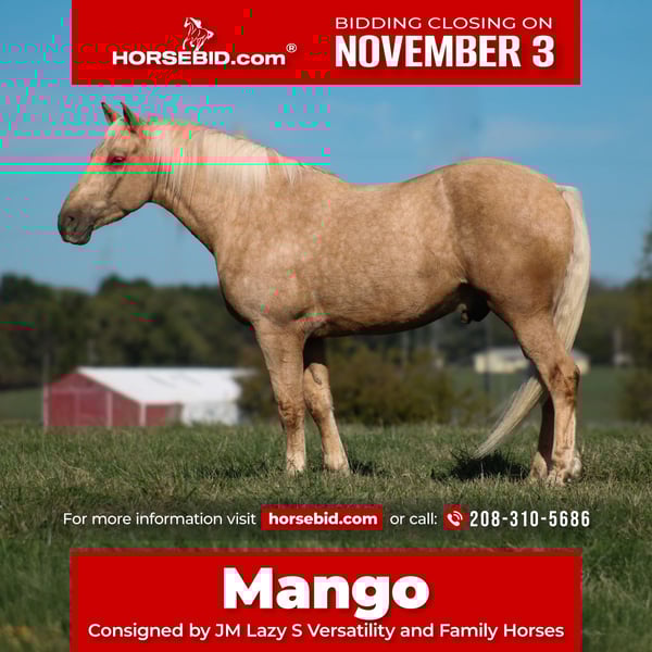 ⚜️𝐓𝐇𝐄 𝐅𝐀𝐋𝐋 𝐇𝐄𝐑𝐈𝐓𝐀𝐆𝐄 𝐂𝐋𝐀𝐒𝐒𝐈𝐂⚜️ Happening now thru MONDAY | NOVEMBER 3rd - Available EXCLUSIVELY on HorseBid's website! For more details and to register visit: www.Horsebid.com CONSIGNOR CONTACT: JM Lazy S Versatility and Family Horses 208-310-5686 LOCATION: Baxter Springs, KS BREED: Draft Cross REGISTERED: No REGISTERED NAME: Mango COLOR: Palomino HEIGHT: 16.2 AGE: 7 GENDER: Gelding Mango is one of those horses that’s just plain fun to be around — the kind you can’t help but smile at. He’s big, golden, and full of personality, with the sweetest heart and the kind of brain everyone wants in their barn. He’ll lope around like a quarter horse on a loose rein, or you can bridle him up English and go jump a few fences or ride out with the hounds — he really does it all. Mango will lope on either lead and has a beautiful departure from a standstill or a walk. His stop is correct and quick and he’ll even slide a bit! Mango can trot around smooth and floaty and is happy to bridle up or just be low and slow. Nothing rattles this guy. Flags, tarps, sleds, bareback rides — he takes it all in stride and keeps his sense of humor while doing it. He’s started over cross-country jumps and shows a ton of try and natural athleticism. He’s also the horse that makes life easier — he sidepasses to the mounting block or fence for you to hop on, and he’s even started learning to lay down. Mango’s the first one to greet you at the gate and will keep you laughing with his goofy, gentle nature. He’s good with his feet, easy to catch, and always happy to see you coming. He’ll side pass either direction, turn on his haunches, maneuver gates, water, logs, brush or traffic like a pro! He’s done some ranch work and spent many a mile on the trail too. He’s got current X-rays (front feet, hocks, stifles, and back) and a recent vetting — the only note being a very small surface scratch on his right eye (from rubbing on his stall door). He’s up to date on dental, chiropractic, worming, shoeing, Coggins, and health. Give us a call or text John (208)310-5686 to see Mango, request his xrays or just chat! Horses like Mango don’t come around often — he’s truly one of a kind, inside and out.