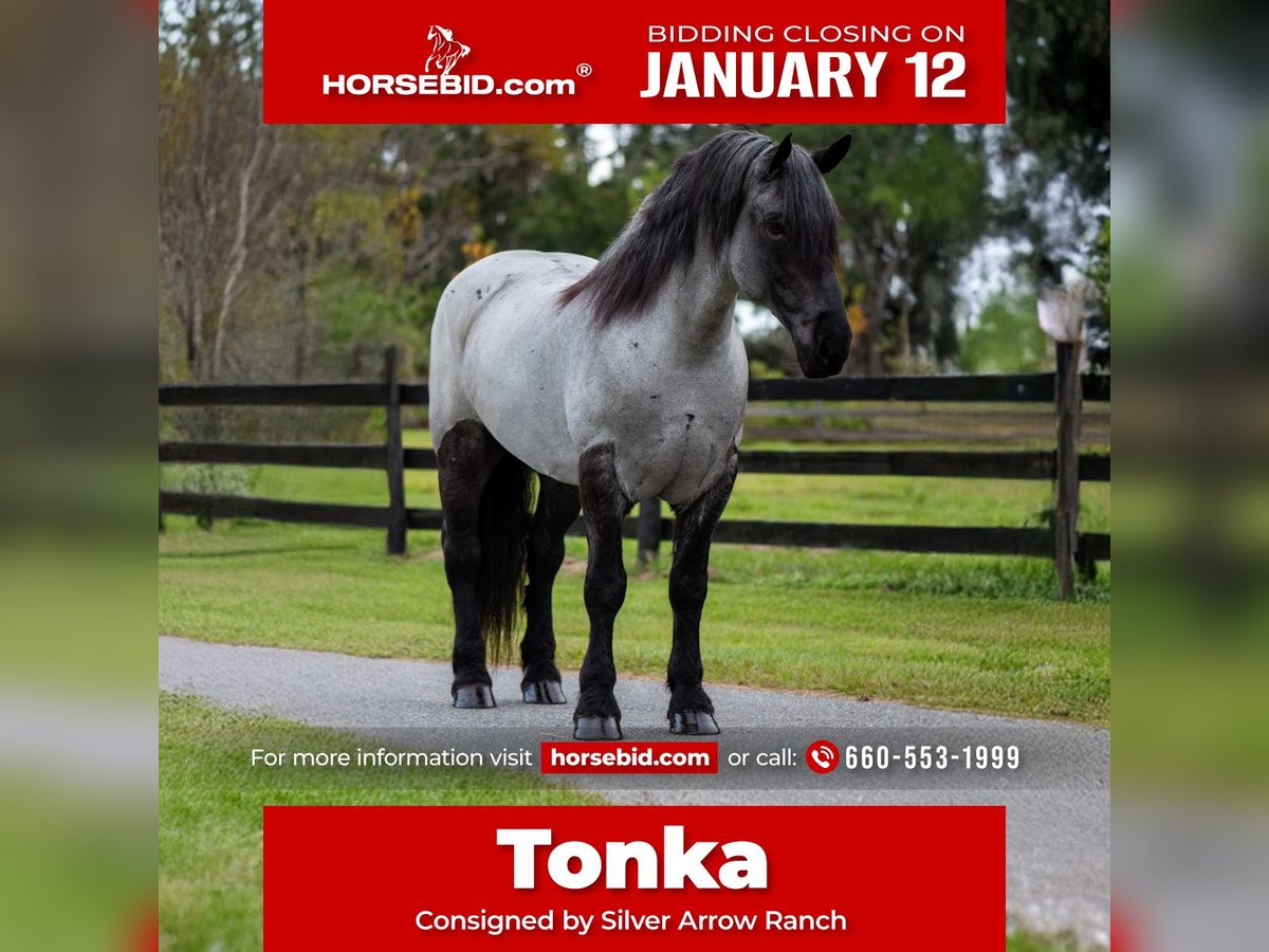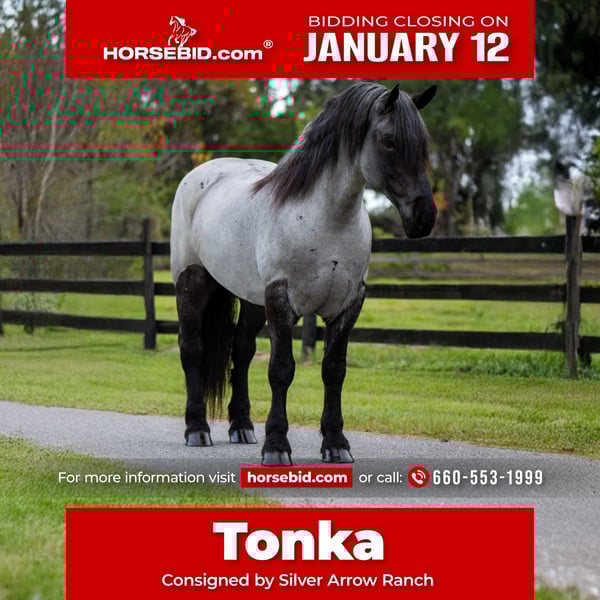 ♦️𝐍𝐄𝐖 𝐘𝐄𝐀𝐑'𝐒 𝑬𝒙𝒕𝒓𝒂𝒗𝒂𝒈𝒂𝒏𝒛𝒂♦️ Happening now thru MONDAY | JANUARY 12th - Available EXCLUSIVELY on HorseBid's website! For more details and to register visit: www.Horsebid.com CONSIGNOR CONTACT: Silver Arrow Ranch 660-553-1999 LOCATION: Ocala, FL BREED: Brabant REGISTERED: No REGISTERED NAME: Tonka COLOR: Blue roan HEIGHT: 17 AGE: 8 GENDER: Gelding Tonka – Your Dream Horse Awaits! Introducing Tonka, the prettiest blue roan you'll ever lay your eyes on! At just 8 years old, this magnificent horse stands 17 hands tall, embodying both beauty and strength. Tonka isn’t just a head-turner—he's a versatile companion who shines in many disciplines. With his smooth gait and graceful movements, Tonka makes every ride a pleasure, whether you're navigating serene trails or enjoying a spirited outing. His sweet, puppy dog personality will steal your heart; he loves people and is always eager to make new friends. Tonka stands patiently for grooming and tacking, making him a dream to work with. He’s also incredibly well-mannered for the farrier, and loads and trailers with ease. This sweet soul is ready to find his forever home with someone who appreciates his kind spirit and striking looks. Don't miss out on the opportunity to welcome Tonka into your life! He’s sure to become your beloved partner in adventure! Call Silver Arrow Ranch for any questions: 660-553-1999