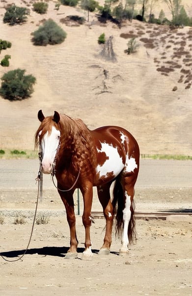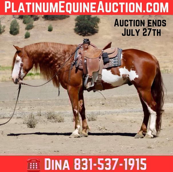 ONLINE AUCTION Place your bids at www.PlatinumEquineAuction.com Starting Bid $3500 Auction ends July 27th 2025 Need a new saddle? Check out White Rock Saddles on our website or Facebook If any horse was ever born to be famous, it’s this one. Axl Rose is a stunning 15.1-hand, 8-year-old Paint/Draft cross gelding with this beautiful long, flowing mane and tail and a presence that stops people in their tracks. He’s the kind of horse who turns heads wherever he goes—you’ll feel like he should be signing autographs! Axl Rose is as gentle as he is eye-catching. With his calm, cool attitude and go-anywhere mindset, he’s a true pleasure to ride. He’s been in multiple parades and handled them like a pro—unbothered by sirens, crowds, honking semis, or heavy traffic. Nothing rattles this guy. In the arena, Axl Rose moves with grace and ease. He lopes slow and soft, carries himself in a relaxed frame, has a solid stop, and a nice ranch-style turnaround.He is one of the smoothest horses we have ever rode. He has also been used to gather,rope and is so eager and willing to do whatever you ask, Whether you’re out to do a job on the ranch or just enjoy the ride, he’s right there with you, giving his all. Out on the trail, Axl is a steady and confident partner. He’s been across all types of terrain, through creeks, over bridges, and calmly walks along without a fuss. He has seen all sorts of obstacles and will conquer bridges, tires and walkovers with ease he has also carried flags,tarps and bouncy balls without a care in the world. He has a great brain and a kind heart, making him a dream for any level of rider. Axl is also incredibly friendly—he’ll greet you at the gate, follow you around like a puppy, and loves attention. He clips, bathes, and ties with ease, stands tied anywhere, is great in both stall and pasture, and hauls like a seasoned traveler. If you’re looking for a family-safe, drop-dead gorgeous, sweet-as-they-come gelding who’ll be the talk of the barn, Axl Rose is your man. Located in Paicines, CA. Contact Dina with Longhorn Ranch 831-537-1915 with any questions. ONLINE AUCTION Place your bids at www.PlatinumEquineAuction.com Starting Bid $3500 Auction ends July 27th 2025 Need a new saddle? Check out White Rock Saddles on our website or Facebook