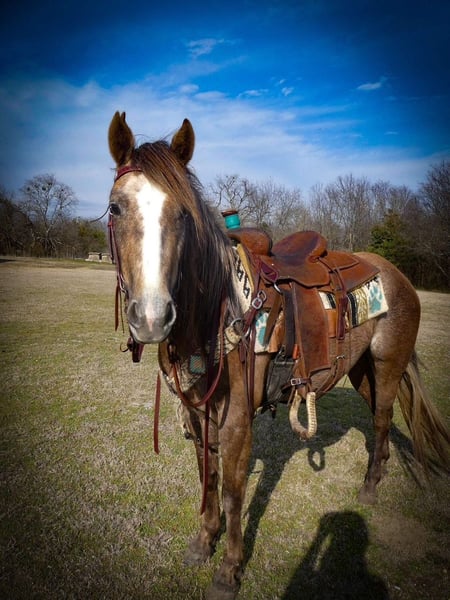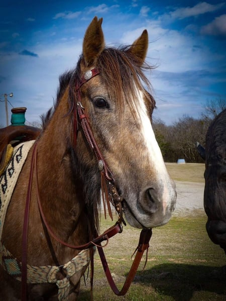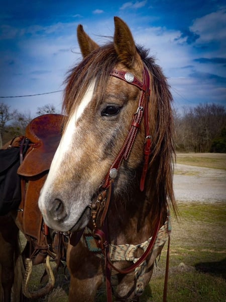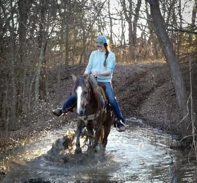 "AVAILABLE ON ONLINE HORSE AUCTION AT www.MagicHorseAuction.com BIDDING OPEN NOW thru TUESDAY | December 23RD! BUY IT NOW AVAILABLE! *Final price will be determined on auction site* CONSIGNOR CONTACT INFO: JUSTINE JACKSON #580-615-1124 LOCATION: Caddo, OK" """Faith Walker is a stunning young Draft Cross mare with a rock-solid foundation and an unbeatable temperament. She is barefoot, sound on all four hooves, with clean legs, bright clear eyes, and overall excellent health. She has passed a Pre-Purchase Exam (PPE) and has current Coggins papers Faith is truly exceptional—extremely gentle, highly desensitized, and impressively intelligent. She’s eager to please, incredibly willing, and has that endearing """"in-your-pocket"""" personality. Her ground manners are impeccable, and she is soft in the mouth, handy with a neck rein, and responsive to cues. She stops on a dime and backs up with ease. This mare is fearless—she goes the pace you ask for, is gun-safe, and is a dream on the trails. She confidently crosses rocks, creeks, steep hills, water, and logs with sure-footed precision. She has seen wildlife and remains calm and composed. Faith can be ridden bareback or with a saddle and is unfazed by dogs, cats, other horses, cattle, traffic, trains, ATVs, lawnmowers, and four-wheelers. She loads and unloads from a trailer with ease, and she’s a breeze to brush, bathe, saddle, unsaddle, and catch—she’ll even meet you at the gate. She stands quietly for the farrier and has no vices or bad habits. With her fearless disposition and strong foundation, Faith is ready for any direction—be it trail riding, mounted shooting, or any discipline her new rider chooses. You simply won’t find another draft cross mare this young, this smart, and this experienced. It has been an absolute privilege to train her, and whoever takes her home is truly getting a gem. Come meet Faith in person or arrange for shipping if you're unable to make the trip.
