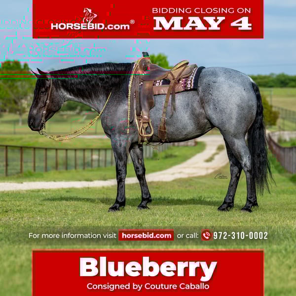 ▪️▫️◾️𝐭𝐡𝐞 𝑴𝒂𝒚 𝐒𝐞𝐥𝐞𝐜𝐭◾️▫️▪️ Happening now thru MONDAY | MAY 4th - Available EXCLUSIVELY on HorseBid's website! For more details and to register visit: www.Horsebid.com CONSIGNOR CONTACT: Couture Caballo 972-310-0002 LOCATION: Fort Worth, TX BREED: Draft Cross REGISTERED: No REGISTERED NAME: Blueberry COLOR: Blue Roan HEIGHT: 16 AGE: 5 GENDER: Mare