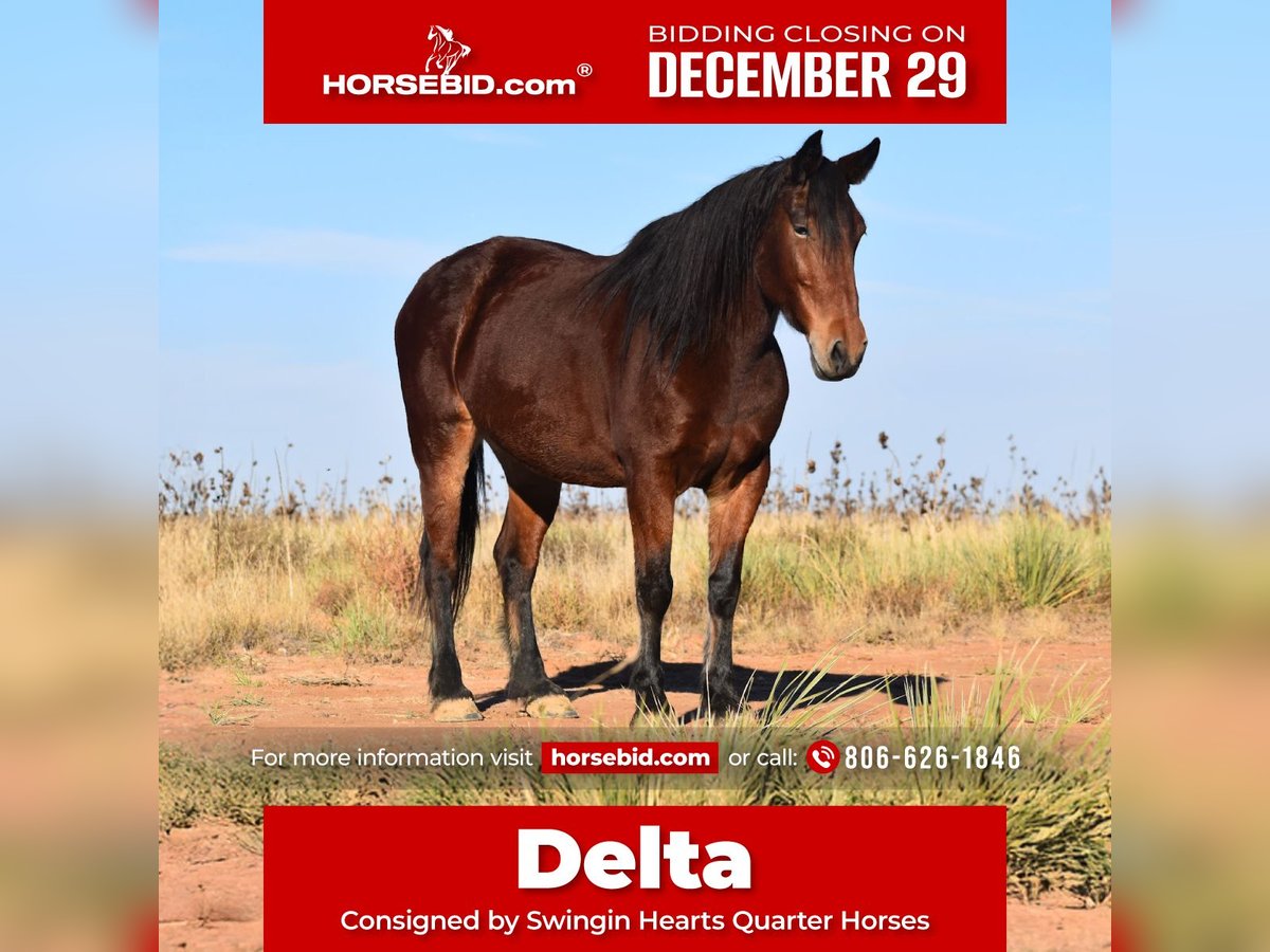 ⚜️𝐓𝐇𝐄 𝓗𝓮𝓻𝓲𝓽𝓪𝓰𝓮 𝐖𝐢𝐧𝐭𝐞𝐫 𝓒𝓵𝓪𝓼𝓼𝓲𝓬⚜️ Happening now thru MONDAY | DECEMBER 29th - Available EXCLUSIVELY on HorseBid's website! For more details and to register visit: www.Horsebid.com CONSIGNOR CONTACT: Swingin Hearts Quarter Horses 806-626-1846 LOCATION: Amarillo, TX BREED: Draft Cross REGISTERED: No REGISTERED NAME: DELTA COLOR: Bay HEIGHT: 15.2 AGE: 7 GENDER: Mare Delta is a 7-year-old draft cross mare, she is a proven, dependable ranch horse. She’s been used in cattle sales and in the feedyard, handling long days and tough conditions with ease. She’s also been trail rode along the Canadian River and is steady, confident, and sure-footed in rough country. She is excellent to rope on in ranch settings, stays calm and dependable, and has the size and strength you want for day-to-day work. This mare is easy to get along with, honest, and built to handle a full day’s riding. Whether you’re doctoring cattle, sorting, or riding outside, she’s a solid horse you can rely on. A good-minded, experienced ranch mare ready to go to work.