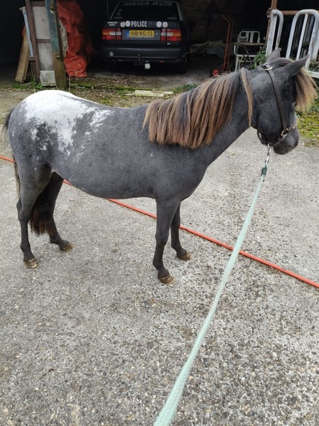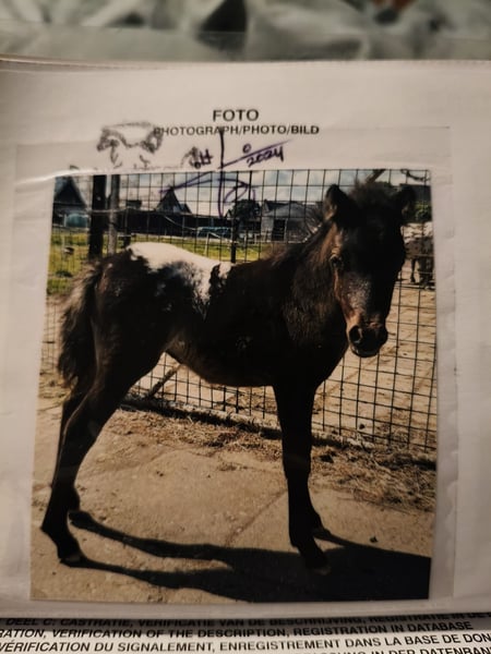 Hello, This is Bonny. Bonny is an American Miniature Horse stallion with NAS pedigree, born on June 25, 2024, standing at 85 cm and still growing. He is beautifully slender built, tall, and straight on his legs with a nice long slender neck and, of course, a thick mane and tail. He has a lovely unique color (black with a blanket pattern) and striped hooves. He goes to the farrier with us nicely; he sometimes finds this a bit challenging but is being worked on. He is still green but very well-behaved, always walks nicely alongside, can lift his hooves properly when lunging, walks easily onto the trailer, and can stand safely tied for longer periods without supervision. He finds traffic a bit exciting, but we are also working on that by taking nice walks along the road. In terms of character, he is very sweet and curious, and if he finds something scary, he will come to you for help. Bonny is a horse that needs a little time to get used to you, but after that, he will do anything for you (his background is known to us). I would love for Bonny to go to someone who genuinely enjoys working with minis and perhaps wants to achieve something with him later on. He is well socialized and lives in a small herd of 6 minis. He is accustomed to dogs, cats, cows, and chickens. (Bonny is not a children's pony, riding pony, pasture mate, or pet.) For more information, feel free to send a message. The price is negotiable for the right home. He will only go to a 5-star home. Best regards, Elise van der Vegt