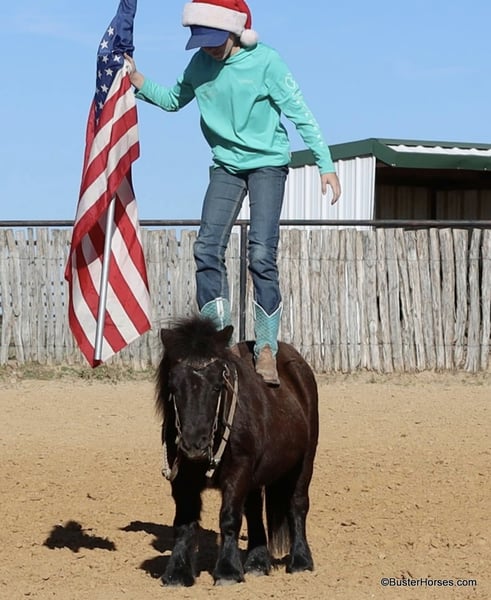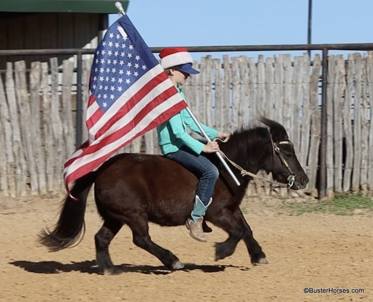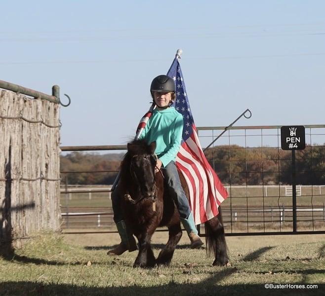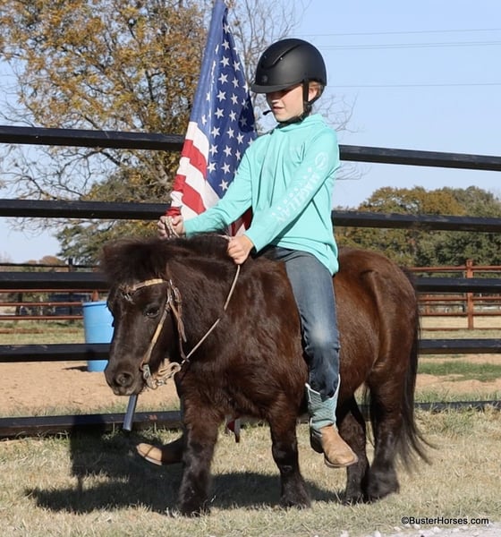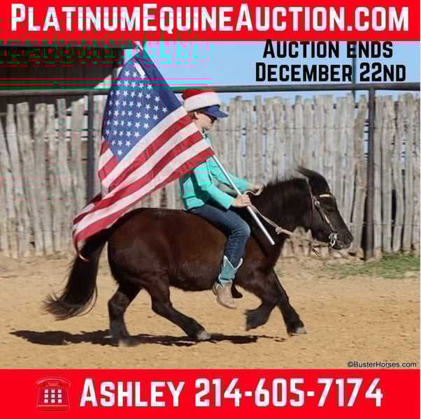 ONLINE AUCTION Place your bids at www.PlatinumEquineAuction.com Starting Bid $3500 Auction ends December 22nd, 2024 Need a new saddle? Check out White Rock Saddles on our website or Facebook! “Wells” – 8.2H, (34”) 12 year old black mini pony gelding…. If you want to see your kids (or grandkids) all out there in the yard enjoying a pony riding from the playground, to the barn, to the pond, then to their playhouse – playing games with the pony in tow….then you have to get them a GOOD pony. Not all of these little tiny ponies are the same! We get lots of little ponies like this that are gentle and will leadline well, but the ones that will both leadline the little toddlers, AND ride around…the ones that will trot and lope, and guide around well for the bigger kiddos too – those ponies are pretty rare! We are lucky to get a handful of ponies like this each year and we go through a lot of little ponies that are not so easy and good-minded….finding these special little ones! Wells is so fun and easy and not remotely intimidating! He is big boned, well put together, and stout made. He is thick and strong enough for the bigger kids to ride too!!! He guides around easily one-handed and will walk all day if that’s all you want to do – he will also happily trot and lope circles just like a big horse! He is a pleasant little guy, with absolutely no rotten little pony attitude – he is adorable. Since the day we got this pony my daughter asks to take him literally absolutely everywhere, if we are hooked up to a trailer, she is trying to load Mr Wells to go with us. He has been on many runs down the trail, has been to many dinners, been through several drive-thrus, been to several family gatherings, been to every park in town – if we are hooked up to a trailer she is loading this one and dragging him along! He hops right on and off the trailer, and will stand quietly all day. He has practically lived on the trailer several days with us … and he eats and drinks well. Wells will stand quietly tied anywhere or will relax and take a nap on the trailer. He is a super cute little jumper, and LOVES it whether it’s a log out on the trail or a real jump in the arena! He is a cute little mover, and would be absolutely adorable for a tiny little kid to do the ground rails, the entry level dressage tests, or walk-trot cross rails on!!! No vices or bad habits – easy to catch, even out in the pasture or in a pen of wild ponies! He is good with his feet and loves a bath! Please call anytime for more information Buster Horses Ashley 214-605-7174 Wells is located in Weatherford, TX – one hour from Dallas / Fort Worth International Airport. He is an easy day trip or fun overnight trip to come try out, from anywhere! We are experienced knowledgeable sellers and we can help with quickly arranging affordable shipping to any buyer’s location – we have experience shipping horses worldwide – including regularly to Hawaii, Canada, Mexico, Europe, and South Africa. Go to our Facebook page Buster Ranch and check our website for buyer reviews, for more videos, additional info, etc: https://busterhorses.com/Wells ONLINE AUCTION Place your bids at www.PlatinumEquineAuction.com Starting Bid $3500 Auction ends December 22nd, 2024 Need a new saddle? Check out White Rock Saddles on our website or Facebook!