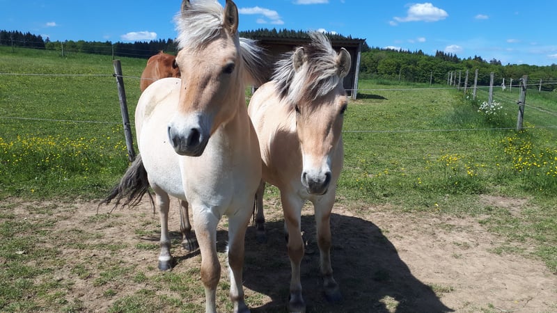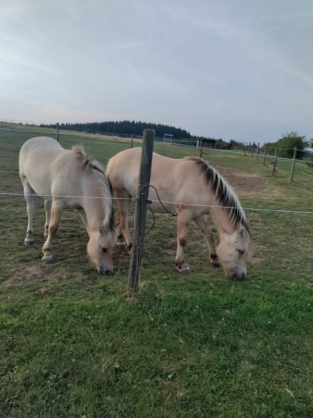 Wir verkaufen aus Altersgründen unsere beiden Fjord Wallache aus 2023 ausschließlich in liebevolle Hände mit viel Auslauf und Weidegang. Die beiden Wallache haben volle Papiere, sind groß und kräftig. Sie sind von jung an zusammen, daher möchten wir sie auch nur zusammen abgeben. Weitere Infos gerne telefonisch unter 0151 681 95 994 Der Preis gilt für beide Pferde zusammen.
