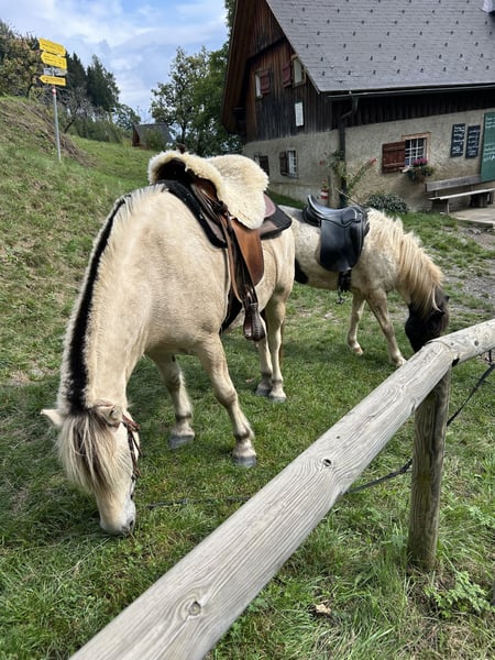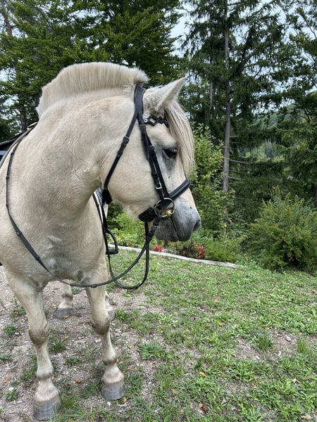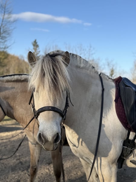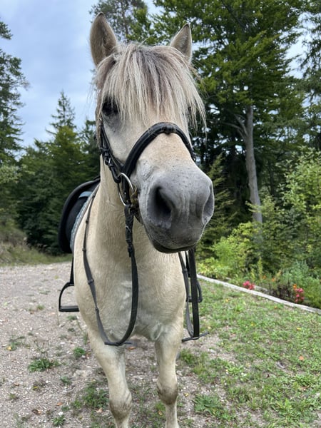 Laurin is a approximately 143 cm tall 5-year-old Fjord horse with a white coat. He was born in 2020 and has been living in our species-appropriate herd since then. In the herd, he is rather dominant. Laurin has been in training for a year now. We started groundwork earlier, so he knows the basics. When riding, he is well-behaved and shows good gaits. He is very sure-footed and loves to go on long, relaxed trail rides. We are not yet as advanced in the riding arena, but he is still in training and is developing every day. Due to his age, he is not suitable for beginners. He is very kind, even with children, and loves to cuddle with them. Laurin needs a consistent but loving and patient owner who spends a lot of time with him regularly. Laurin is a very people-oriented and affectionate horse who enjoys closeness. He is also very well-behaved with the farrier, but he has never been shod as he has good hooves. There have never been any problems with trailer loading either. Laurin can be viewed and tried out for riding by appointment. We are also happy to send current videos upon serious interest. Please feel free to contact us for more information.