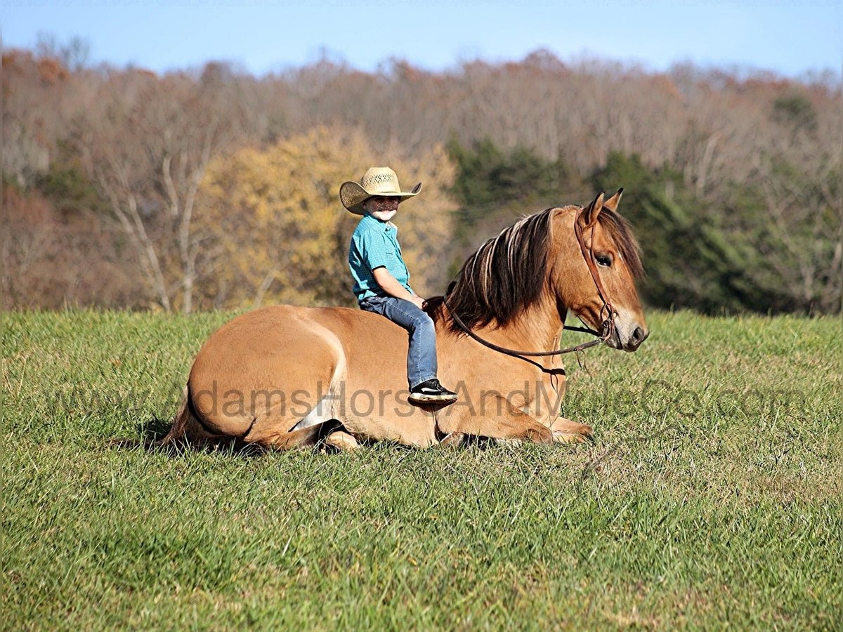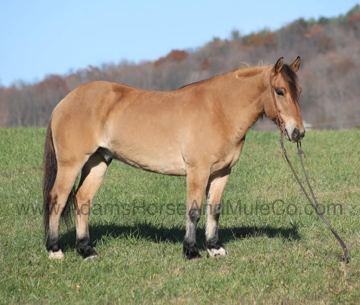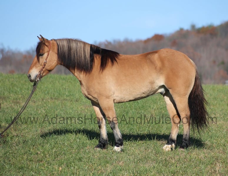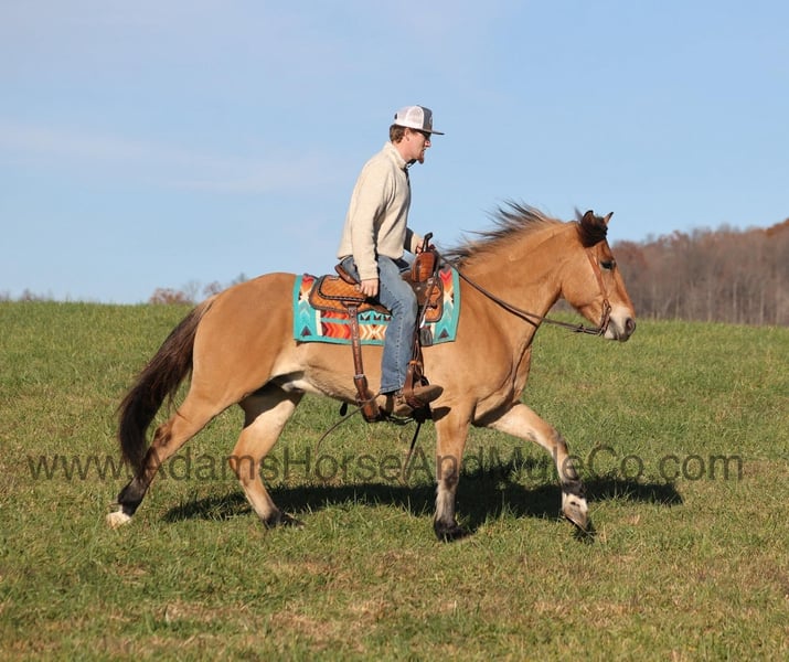 Go to visit our website for more pics and a video. AHAMC has been in the horse business and sold horses over the internet since 2005. We have a long track record of success with hundreds of happy customers. We work hard to match riders with the correct horses and specialize in beginner safe, family friendly horses that have been used and checked out by our family! Ariat is as different as any crossbred that we have had! He is a Fjord/Quarter Horse cross and he has he look of the Fjord with that golden buckskin coloring and the ridability of a quarter horse, so he is the best of both worlds!!! Ariat stands 15.1hh. He will weigh 1200lbs and he is a 2019 model. Ariat is certainly an attractive fellow but there is a lot more to him than what meets the eye! Ariat is everyones best friend as he loves attention and is very calm natured. Ariat is out of the same breeding program as several other top draftcross geldings that we have had over the last 4 years and every one of them has the right mind with the calm nature that makes them great family horses. Ariat has been with us since last year and has completed the natural horsemanship training and has done liberty work and he also knows some tricks such as he will lay down. Ariat has been ridden by every member of our family all the way down to our 6 year old daughter. He has been ridden down the highways and he is traffic safe as well. Ariat is great on trails and he will cross creeks, ditches, logs and navigate rough rocky areas. He has a smooth jog, a VERY VERY nice easy to set lope, a good stop, reins around and turns a circle both ways and backs with ease! He has been exposed to all kinds of wildlife such as deer or turkey or other animals like cows or dogs and will go anywhere that he is asked too. He has been rode many miles in the mountains of Eastern Kentucky and encountered every obstacle possible on the trail. He will go up or down even the steepest slopes, across deep creeks, over downed trees, and over all types of rough terrain while still being sure footed. Ariat is not cinchy, cold backed, does not crib or weave. In addition to riding, Ariat has also been driven down the highways as well. Ariat is a rare find that anyone is lucky to have!!! Feel free to call Eric 606-308-2461 with any questions.