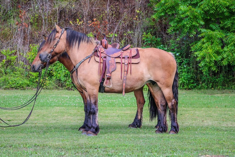 ONLINE AUCTION Place your bids at www.PlatinumEquineAuction.com Starting Bid $3500 Auction ends July 21st, 2024 Need a new saddle? Check out White Rock Saddles on our website or Facebook! YOU ARE BIDDING ON THE PAIR (2 HORSES FOR 1 PRICE) This is “THELMA & LOUISE”, a super versatile, unique, well broke, and pretty team of FJORD QUARTER HORSE CROSSBRED MARES that are full sisters. They are 7 and 8 years old standing 15.1hh. These mares are both extra gentle, anyone can ride or drive them, and they are both friendly and personable. They are thick made with lots of muscle, heart, and style. They have been hitched to all farm machinery and work double or single. They have been shown in the hitch classes in womens pleasure. They have been used on a ranch for wagon rides, they have been in the holiday parades, and on overnight camping trips. They trail ride for any level rider and have been ridden by small children. They move out nice, stop on whoa, back up, and have no issues. They both load, haul, bathe, stand tied to be harnessed, hitched, and groomed, and they are well mannered. This team is traffic safe, super dependable, and ride and drive the same EVERY trip out of the barn. These mares have also been in the unicorn hitch and will work in any position. If you want a super rare team of Fjord crossbred mares, don’t miss out. They are sure footed, fun to ride, easy to drive, and calm. LOcated in Flemingsburg, KY. Contact HH Horses Erin 304-238-4155. ONLINE AUCTION Place your bids at www.PlatinumEquineAuction.com Starting Bid $3500 Auction ends July 21st, 2024 Need a new saddle? Check out White Rock Saddles on our website or Facebook!