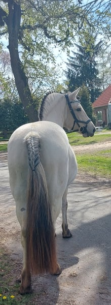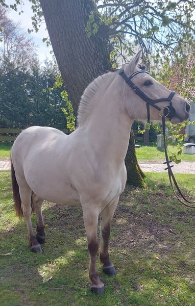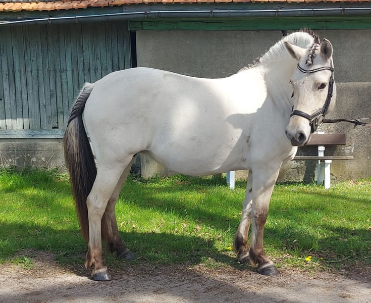 Bildschöne, bezaubernde weißfalb Fjordstute sucht 5-Sterne-Zuhause. Fine ist eine hübsche, artige und sehr verschmuste 7jährige Stute mit bestem Papier (). Im Offenstall im Herdenverband aufgewachsen, regelmäßig geimpft, entwurmt, dem Schmied vorgestellt (barhuf) und Zähne gemacht (zuletzt Juni 2025). Super artig unterm Sattel, im Schritt und Trab sicher geritten, am Galopp und der Lenkung arbeiten wir noch, sitzbequem. Kennenlernen und Probereiten jederzeit (nach Terminabsprache) möglich. Sie ist ca 141cm groß. Fine ist keine Schlaftablette, hat go. Ist aber gut händelbar. Hatte 2025 ein bildschönes Stutfohlen vom Quarter Horse Hengst Mobsters Snow Gun. Hat problemlos aufgenommen, alleine abgefohlt und ist eine tolle Mutterstute