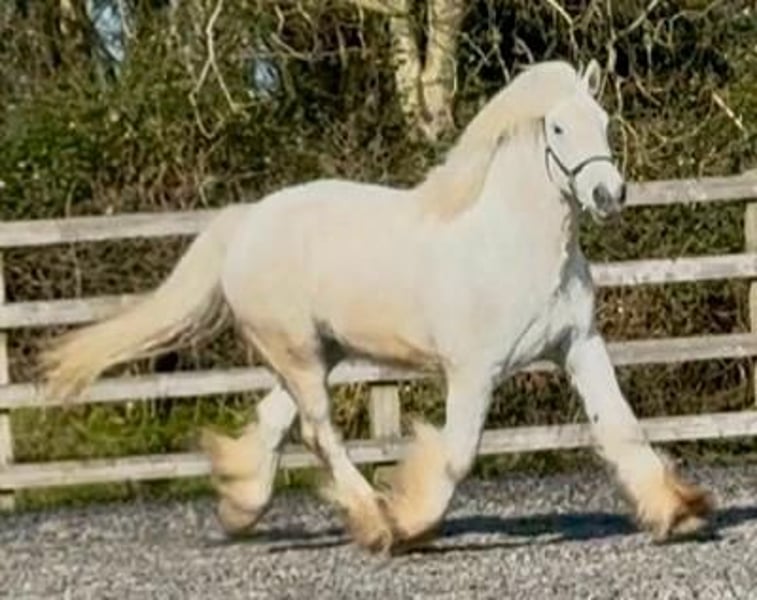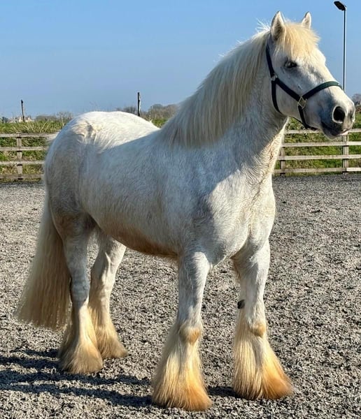 15 hh Heavyweight Irish Show Cob gelding, 3 years old. Dapple Grey with 4 white socks, 10 inches of bone, expected to mature 15.2 hh . Well handled, used to busy farm life, outstanding kind temperament, always aims to please. A super quality horse with a big future ahead of him.We can help with transport. More videos are available on our FB page CC Equine UK, Instagram and TikTok