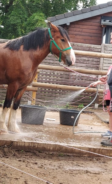 Due to lack of time, we are selling our wonderfully sweet Irish Cob gelding, "Potato." Potato is a very calm horse with a gentle character. He is not yet backed but can be easily saddled and mounted, remaining calm throughout. Groundwork has been done with him following the Natural Horsemanship method (Martin Kreuzer Academy). He is also experienced with trailer loading and walks comfortably on a lead rope. The trailer is no problem for him, even for larger horses. He would also be ready to be backed. We are only offering Potato to a good home with outdoor turnout (no box stall housing). Getting to know him is a must. We are not in a rush to sell, so we will carefully select the buyer. The horse will not be sold on a first-come, first-served basis. Further information gladly available upon request.