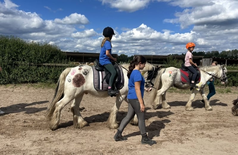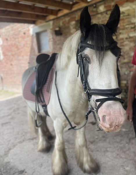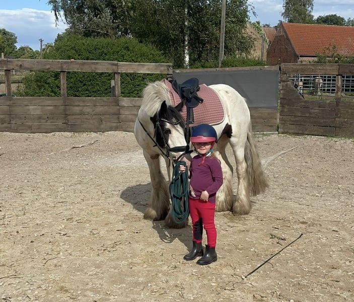 For sale is this beautiful 7-year-old Irish Cob gelding with a height of approximately 145 cm. Cookie is undoubtedly the most likeable and loyal companion you could ask for. He is very responsive to aids and well-balanced to ride, and he is very relaxed on the go! He has the patience of an angel and nerves of steel! This gelding impresses with his good work ethic and is bombproof even in traffic! He is also driven single! He is familiar with overcoming obstacles and loves trail rides - He has also done some cross-country courses and shows great joy in jumping! You can always rely on Cookie; he is a true buddy that you want to cuddle with all day! He loves affection and enjoys the attention of many children around him! On trail rides, he is very calm and unflappable! He has a pleasant and steady go and can be handled by any child! Super cuddly and people-oriented. The absolute dream pony for re-riders, children/young riders, riding schools, but also suitable as a therapy pony! He knows how to ride in groups and has no problem with it - he can go in front, in the middle, or at the back.
