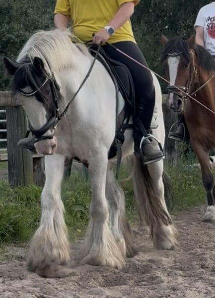Te koop is deze prachtige 7-jarige Irish Cob ruin met een schofthoogte van ongeveer 145 cm. Cookie is waarschijnlijk de meest sympathieke en trouwe metgezel die je je maar kunt wensen. Zeer fijn aan de hulpen en goed uitgebalanceerd te rijden, en hij is erg ontspannen onderweg! Hij heeft een engelachtige geduld en absolute zenuwen van staal! Deze ruin overtuigt met zijn goede werkhouding en is bombproof, ook in het verkeer! Hij is ook eenspanig gereden! Hij kent het om hindernissen te overwinnen en houdt van buitenritten - Hij heeft ook al een paar cross-country parcours gelopen en toont veel plezier in het springen! Op Cookie is altijd vertrouwd, een echte maat waar je de hele dag mee kunt knuffelen! Hij houdt van aandacht en geniet van de aandacht van veel kinderen om zich heen! Bij buitenritten is hij zeer zenuwsterk en onbevreesd! Hij heeft een aangenaam en rustig tempo en is door elk kind te hanteren! Super knuffelig en mensgericht. Het absolute droompony voor herintreders, kinderen/junioren, rijscholen, maar ook inzetbaar als therapiepony! Kent groepsrijden en heeft daar geen probleem mee - loopt vooraan, in het midden, maar ook achteraan -
