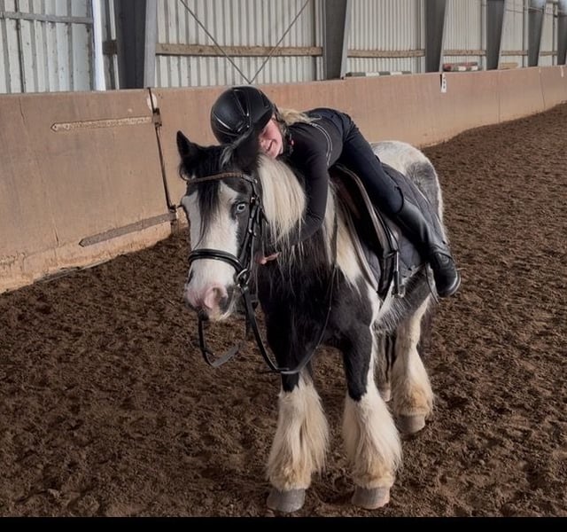 Cariñosa y pequeña yegua para los jóvenes amantes de los Tinker. La pequeña es bastante tranquila y va muy bien en el campo. Un buen poni para el primer contacto con un caballo. La pequeña posee pasaporte de equino inglés.