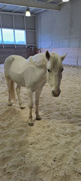 The 12.5-year-old Connemara cross gelding, standing at 14.8 hh, is a versatile all-rounder: suitable for dressage, gymnastics work including jumping, lunging, ground work, hacking, and more. He particularly enjoys ground work and lunging, showing great enthusiasm and pleasure in the interaction with his handler. While show jumping is not his forte, he proved during the "Youth Day" that he is a well-behaved and reliable partner in competition situations. Out in the field, he prefers to be ridden in pairs or with several horses. He is not a beginner pony per se, but he is consistently patient and cautious when lunged with younger children. Teenagers aged around 9 and older with good riding skills can ride him alone. He has successfully completed the certificate and diploma with a 10-year-old child. We hope for this playful gelding, who loves water in the summer, to find a permanent place as a "number one." As he values consistency and does not appreciate frequent rider changes, we are looking for a home with a maximum of three regular handlers in a recreational setting. He is fully vaccinated, dewormed, and has been checked by the veterinarian. He also behaves very well with the farrier and is familiar with both barefoot and shod hoof care.