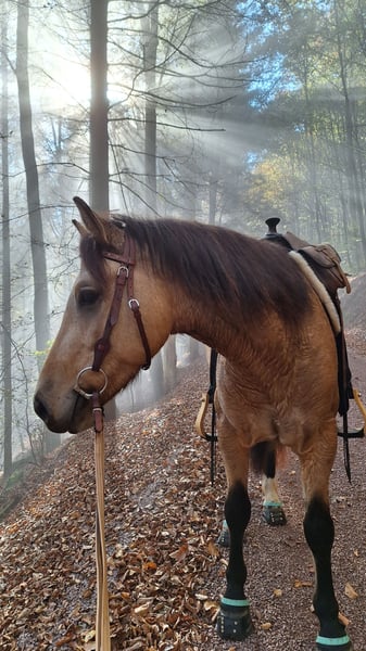 Ich verkaufe meinen 5 jährigen Connemara-Mix Wallach, ca. 145 cm, deckt gut ab, die Reiterin auf den Bildern ist 1,68 m. Er stammt von der Stutenmilchfarm Zollmann. Sein Vater ist der Connemarahengst Spirit. Ich habe ihn dort knapp 3jährig Ende 2023 als Hengst gekauft und habe ihn kastrieren lassen. Im Frühjahr 2024 wurde er von einem Horsemanship Trainer angeritten. Im Anschluss habe ich ihn langsam gestartet: auf dem Platz habe ich hauptsächlich Bodenarbeit mit ihm gemacht und im Gelände war ich anfänglich mit ihm spazieren. Nach und nach bin ich immer mehr geritten. Ende 2024 war er nochmal 2 Monate in Beritt. Letztes Jahr war ich viel mit ihm Ausreiten, alleine und in Gruppen. Im Sommer war ich 3 Tage mit ihm im Elsass bei einer Wanderreitstation und bin mit ihm dort ausgeritten. Das hat er toll gemeistert. Er ist trittsicher, unkompliziert, ausgeglichen, unerschrocken, clever und für jeden Spaß zu haben. Er hat gute Hufe, aber die Wege hier sind so steinig, dass er Hufschutz braucht. Im Gelände verwende ich deshalb Hufschuhe. Regelmäßig dem Schmied vorgestellt. Letzten Sommer habe ich ihn vorne insgesamt 4x beschlagen lassen: das hat von mal zu mal besser geklappt, aber er steht noch nicht vollkommen ruhig. Ich kann ihn alleine verladen. Bei mir war er nie ernsthaft krank. Im Winter steht er nachts in einer Box, tagsüber auf einem Paddock mit 8 anderen Pferden. Im Sommer ist er nur draußen. In der Herde hat er einen mittleren Rang. Ich verkaufe ihn, weil sich bei mir im Lauf des letzten Jahres einiges beruflich geändert hat und ich dadurch zu wenig Zeit für ein Jungpferd habe. Deshalb ist er bis Ende Februar wieder in Beritt. Die Trainerin sagt über ihn, dass er eine steile Lernkurve hat, dass Dinge, die man ihm erklärt/beigebracht hat, auch ungeübte Reiter abfragen können und dass er auch mal einen Fehler verzeiht. Wegen seinem jungen Alter ist er noch nicht für Anfänger geeignet und noch kein Gewichtsträger. Er wird nur in gute Hände verkauft. Im Preis ist sein Zubehör (Westernsattel, Trense, Pad, Decke, etc.) enthalten.