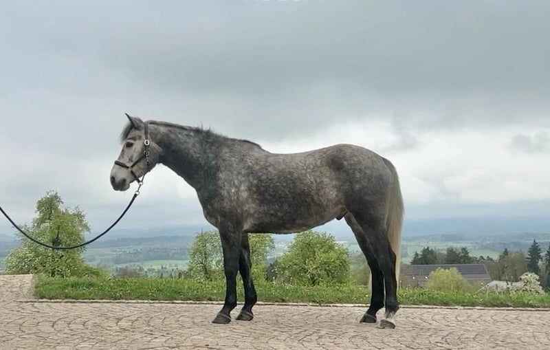 Gelding, Grey, born in 2020, Connemara, 15.2 hh Versatility at its finest – but see for yourself! The photos and videos speak for themselves. He is very people-oriented and gentle in handling as well as under saddle. He is content with himself and the world around him, approaches new learning steps calmly and with interest, and I believe he will be talented in many disciplines. Under saddle, he is well-rounded and has a very pleasant temperament. He is familiar with riding in the arena and in the field, and he is comfortable in group settings at all gaits and positions. When ridden alone, he can still be somewhat unsure in certain situations due to his age, but he never reacts impulsively. His solid, correct conformation makes training straightforward and easy. He has never been injured or ill. In ground work, Teddy is also very interested in everything and knows the basics of equicentric training and lunging in a bitless bridle. We are looking for a person or family who loves Teddy, wants to spend a lot of time with him, and can continue to develop him. I see Teddy successfully competing in many disciplines with an ambitious leisure rider, but he is also suitable for pure recreational riding. A good home with plenty of turnout is very important to us! He lives here in an open stable and gets along perfectly with the other horses, being playful and social. Teddy was born in the Connemara National Park and spent his ideal childhood there. In 2024, Teddy moved to Switzerland. His owners are emigrating, which is why he is now available for sale. Getting to know him in 8132 Hinteregg.