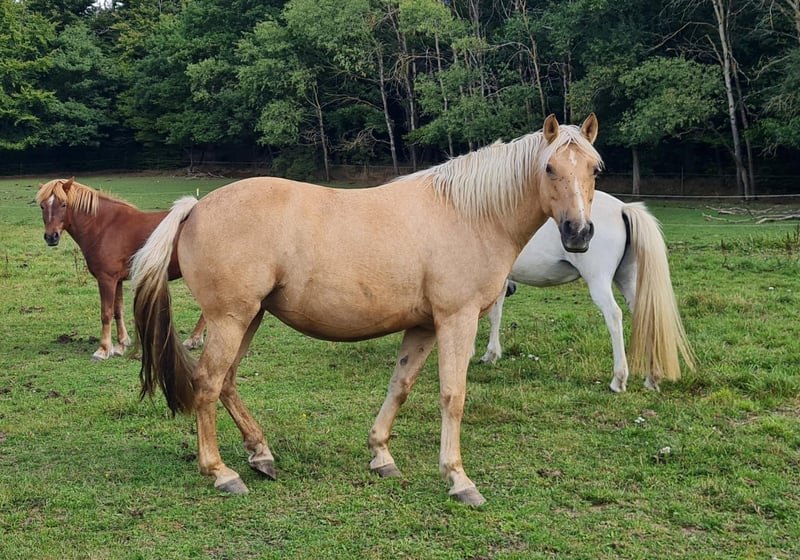 Beautiful, affectionate, and eager to perform mare seeking a confident rider (or equestrian) who can provide her with security and an engaging, varied life. Penny is 9 years old and was bred at the Odenwald Spa Stud. Her exceptional pedigree reflects this: her sire is a Trakehner Pinto cross, and her dam is a Connemara-Haflinger. With a height of 15.5 hh, she comfortably suits taller riders. Penny is very people-oriented, alert, and agile. She is eager to move and occasionally excitable, but she demonstrates smooth, well-regulated gaits. We see her excelling in disciplines such as TREC, Working Equitation, trail riding, and especially for enjoyable hacking adventures. While she could certainly be developed further in dressage, she doesn’t particularly enjoy arena work. Due to her temperament, she is NOT suitable for children or beginners. However, she loves and is accustomed to gentle petting from children. Penny has spent her entire life in an open stable and should continue to do so. She is barefoot and can walk over paved paths comfortably. In recent months, she has become somewhat rounder due to limited riding, but there are no signs of EMS, especially with free-choice hay and lush summer pasture. Trial rides in the terrain are possible. Private sale, therefore no returns or warranty. The seller is an intermediary, not the owner, and receives no compensation.