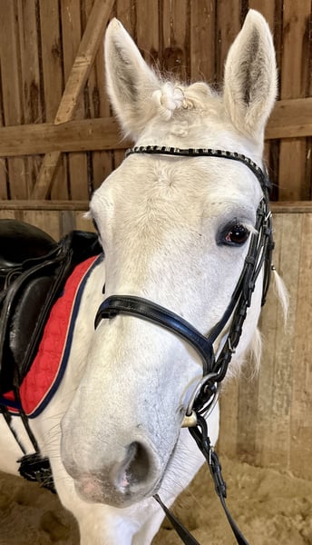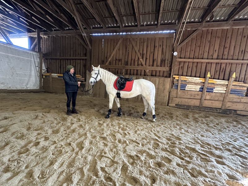 Cooperbeech Dutchess Cooperbeech Dutchess was born on 28.02.2018 at the famous and very well-known but fine Cooperbeech Connemara stud farm of Tomas and Fiona Grimes in beautiful Ireland. Cooperbeech Dutchess, came to us at our Lisbergs stud at the age of 2. Dutchess, as we call this beautiful gray mare with a final height of 1.47 m, is a dream, she loves people more than her own child. Dutchess had split a cheek tooth when she was 4 years old, which was removed from the inside at the "Stephansmühle" veterinary clinic, the aftercare and rinsing was carried out by the Bamberg veterinary clinic. That was many years ago without any consequences. Like all our horses, we have her dentally examined and treated once a year. Dutchess successfully passed her performance test in Ansbach on 16.11.2022 with a score of 7.18, she was ridden bitless until 2 days before the test due to her dental surgery and still felt a little uncomfortable with the double-broken ring snaffle at the time. Today, this is no longer a problem and Dutchess performs superbly with and without a bit at a good A dressage level. Dutchess is a registered broodmare and had a beautiful, very good, healthy colt by our Lettermuckoo Hazys in 2024. The little Lisbergs Hercules was weaned in October. As his mother loves people more than her own child, we have decided to sell our Dutchess as a Connemara riding pony! Unfortunately, shortly before weaning, little Hercules bit off the tails of all the broodmares in the loose stable one night. These are now growing back on every mare and this is unfortunately still clearly visible on Dutchess. Cooperbech Dutchess is a daughter of the very well-known GLENCARRIG KNIGHT, a stamp stallion of the Irish Connemara breed. Her dam COPPERBEECH STAR descends from CLONBERNE BOY a VILLAGE BOY son on her sire's side and from CURRACHMORE CASHEL and GLENCARRIG PRINCE on her dam's side, just to name a few very well-known ancestors in her pedigree. Dutchess's parents are both Class 1 and HWSD N/ N is registered in the 1st main studbook of the Hanoverian Pony and Small Horse Breeders' Association. Dutchess has no sweet itch or other abnormalities such as weaving or bucking! Dutchess travels very confidently with horse transporters or in trucks! She is an ideal pony for people who would like to have a larger and compact pony later on. Dutchess is a real Irish lady, always friendly - in the group she has good social behavior and avoids quarrels, but does not allow herself to be "bullied". Dutchess has beautiful ground-covering gaits and a very fine character in the open stable group and in the panel stall stable, she is vaccinated with EHV1.4 as well as tetanus and equine influenza and regularly dewormed. Due to her size, Dutchess is suitable for pony sport, pony games and, due to her calm nature, also for the therapeutic part of riding, as well as a riding horse for larger riders, as she is very sturdily built. The break and the later breaking in did her a lot of good both mentally and physically. Don't forget that Connemara ponies are not fully grown and developed until they are 7-8 years old, so age-appropriate riding is a guarantee that you will enjoy your pony for a long time! Well cared for Connemaras are long-lived and 30 years is not uncommon for the breed! Dutchess is well lunged and well ridden according to her age! However, we see Dutchess more as a dressage pony or family or therapy pony or show pony, as she knows how to present herself. Dutchess is barehoof! Dutchess loves to move in nature! She is super relaxed when mounting and dismounting! Due to her good character and friendliness towards other horses and dogs, she would also be a good safe cross-country horse for a not so strong rider with a dog or for riding hunts! Of course Dutchess also goes out alone, can be ridden to and from a group and comes home with the rider on her back! She is road-, cross-country- and traffic-safe even with weaker riders. Dutchess walks and trots well and also canters off-road, but in our small indoor arena and in the arena it is still difficult for her to canter with a rider for a long time due to her lack of muscles and ballance (mother time!)! If you like Cooperbeech Dutchess, please contact us directly at the numbers given in the ad and include your name and mobile phone number in an email - you are also welcome to contact us directly via WhatsApp at 00491713415878, unfortunately mobile telephony does not work or only very poorly in our beautiful town. On the last picture you can see Dutchess father Glencarrig Knight. The complete pedigree can be found in the documents, as ehorses often swallow parts of the pedigree. We charge an introductory fee of 50€ per visit to our farm and 70€ on Sundays and public holidays must be paid in cash in advance on arrival! Best regards and maybe see you soon - Gestüt Lisbergs is always worth a visit! Lisbergs Stud