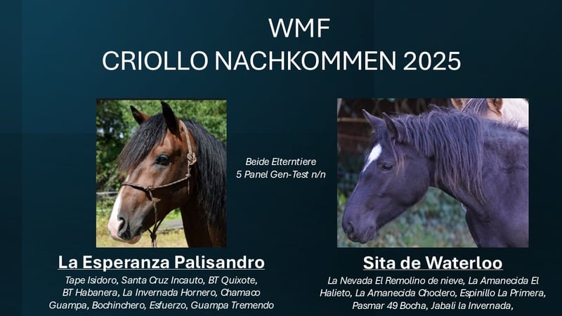 BREEDING ANNOUNCEMENT!!! Palisandro is a double of his WORLD-FAMOUS father Tape Isidoro! He is one of the few purebred Criollos who is a direct descendant of the famous Tape Isidoro. 5 Panel Genetic Test n/n Information about Tape Isidoro: Tape Isidoro was born in Uruguay in 1995. Arriving in Germany at just 5 years old, he soon became World Champion, Vice World Champion, and fourth in Cattle Penning. Then came the licensing in Munich. The surprise was great when he became the licensing champion. He was the first Criollo at the Americana and placed 6th in the Working Cowhorse at the European Championship. With over 100 wins and placements in Reining, Trail, Horsemanship, Pleasure, Working Cowhorse, and Working Equitation Master Class. He has successfully participated in many trade fair appearances with joy. You are a legend in Criollo breeding. He passed away in 2024 at the age of 29. Our PALISANDRO is not only a spitting image of him visually, but also character-wise, he is the exact replica of his father and probably one of the few direct descendants in Germany of Tape Isidoro, who serves as a breeding stallion. More information and videos can be found at the following link: https://www.facebook.com/p/Criollo-Hengst-Tape-Isidoro-100063710221535/ The last pictures show Tape Isidoro! www.wmf-criollozucht.de Price on request